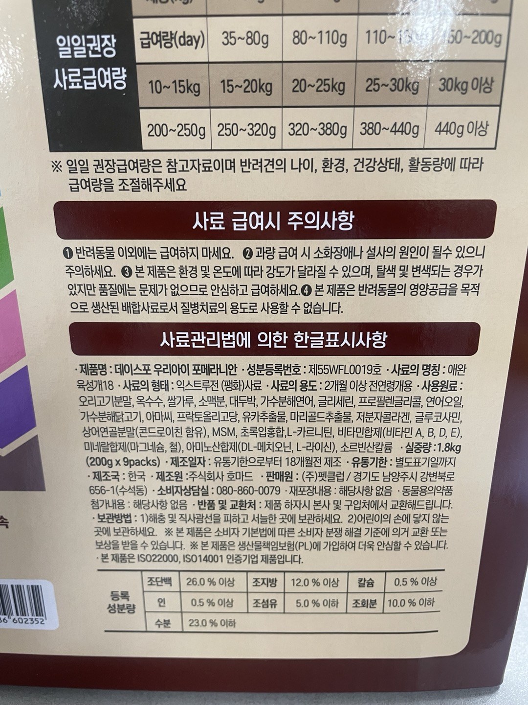 | 품명 및 모델명 | 데이스포 우리아이 포메라니안 | 인증/허가 사항 | 사료관리법에 따른 성분등록번호 : 컨텐츠 참조 |