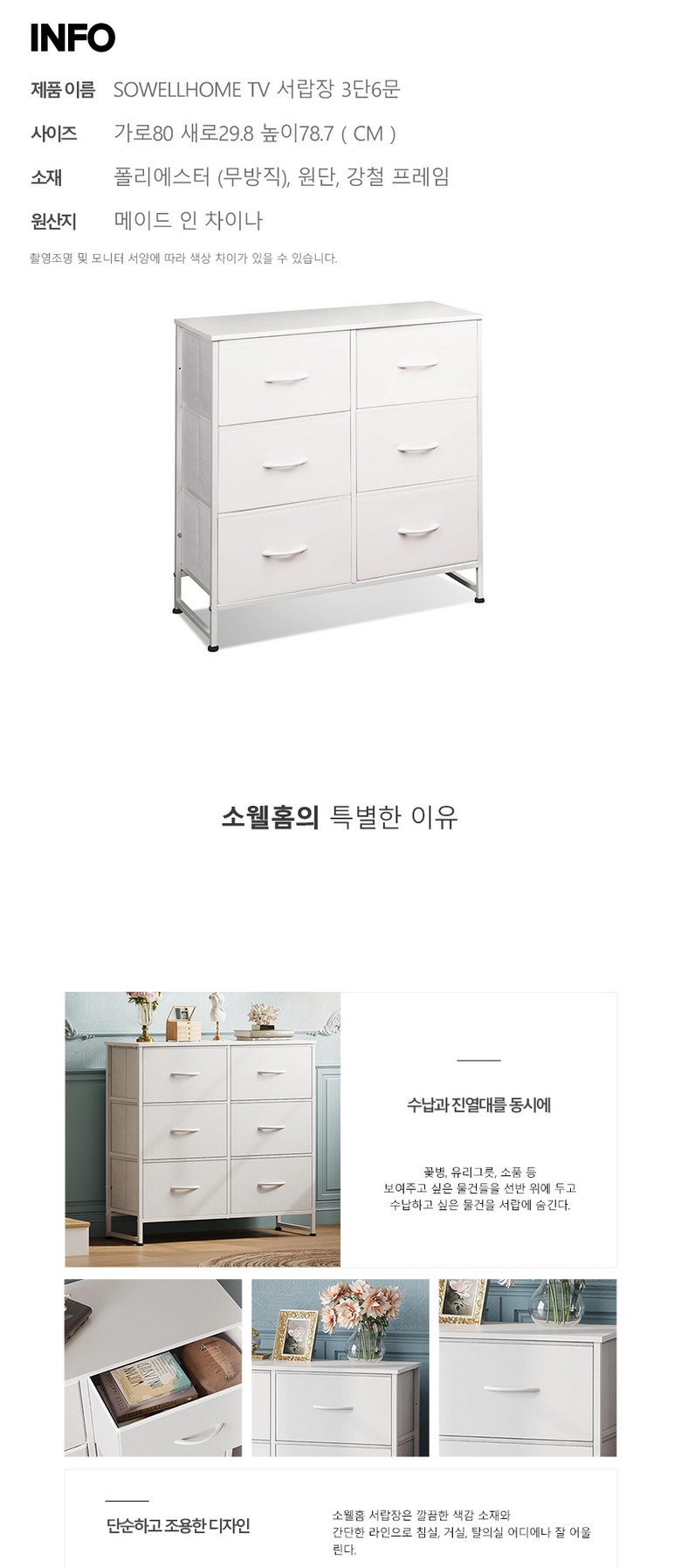 | 품명 | 소웰홈 패브릭 3단6문 서랍장 | KC 인증정보 | 해당없음 |
