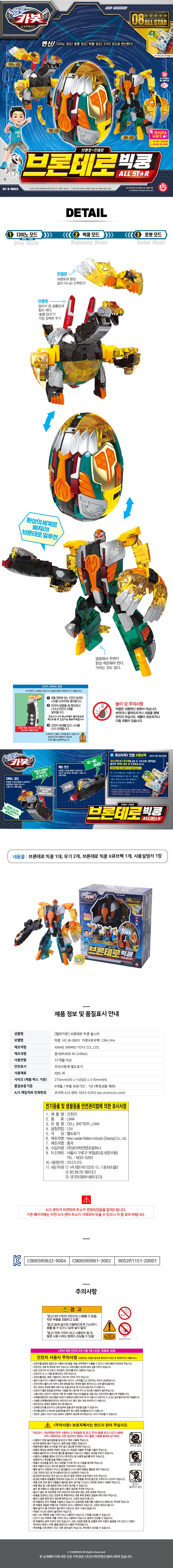 | 품명 및 모델명 | 헬로카봇 브론테로빅쿵 올스타 | KC 인증정보 | 빅쿵 : CB065R0632-9004 / 카봇, 큐브팩 : CB065R0961-3002 / 건전지 : B052R1151-20001 |