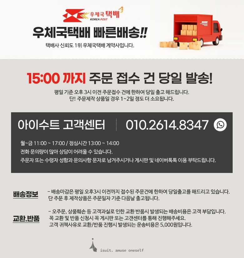| 배송기간 | ㆍ도서산간 지역 등은 배송에 3-5일이 더 소요될 수 있습니다. - 천재지변, 물량 수급 변동 등 예외적인 사유 발생 시, 다소 지연될 수 있는 점 양해 부탁드립니다. | ||
