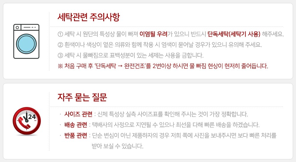 - ㆍ모니터 해상도의 차이로 인해 색상이나 이미지가 실제와 달라, 고객이 단순 변심으로 교환/반품을 무료로 요청하는 경우