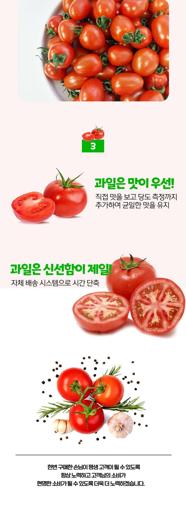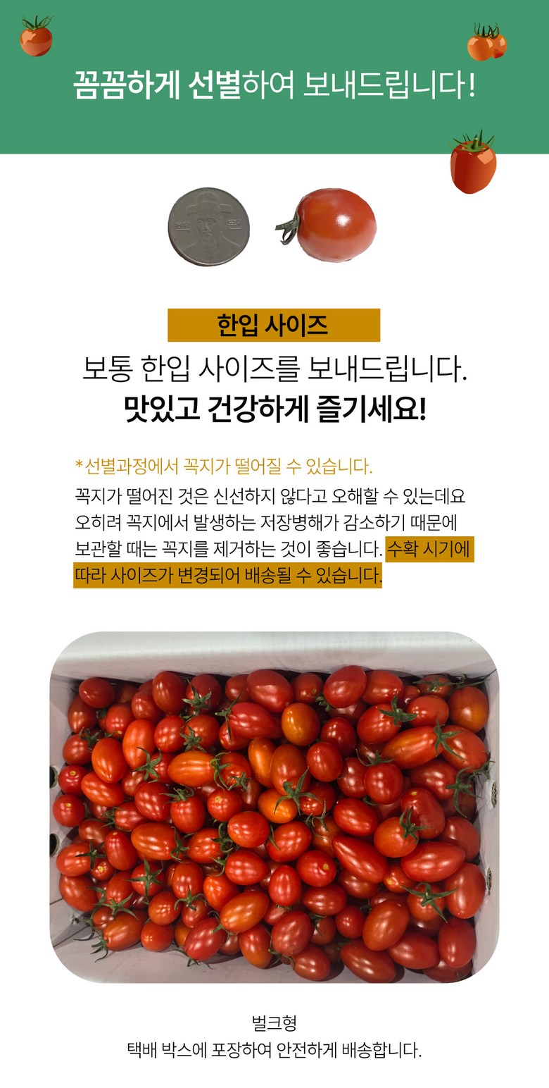 *토마토는 원체 말랑합니다. 토마토가 단단하지 않다는 사유로는 반품이 불가합니다. 가정집에서는 하루 이틀 빠른 시일 내에 소진할 수 있는 양으로 주문 바랍니다.