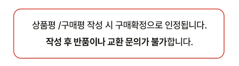 | 교환/반품 신청 기준일 | ㆍ단순변심에 의한 교환/반품은 제품 수령 후 7일 이내까지, 교환/반품 제한사항에 해당하지 않는 경우에만 가능 (배송비용과 교환/반품 비용 왕복배송비 고객부담) ㆍ상품의 내용이 표시·광고의 내용과 다른 경우에는 상품을 수령한 날부터 3개월 이내, 그 사실을 안 날 또는 알 수 있었던 날부터 |