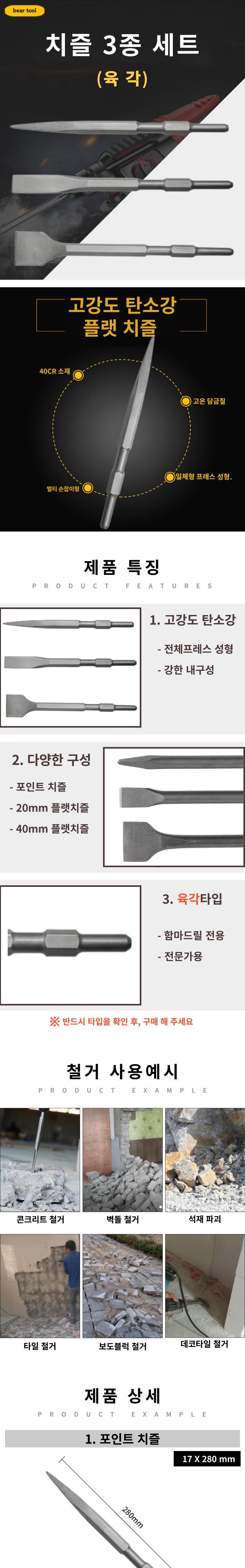 | 품명 및 모델명 | 베어툴 육각 3종 [포인트 + 20mm플랫 + 40mm플랫] 탄소강 포인트 플랫 치즐 | KC 인증정보 | 상품 상세페이지 참조 |
