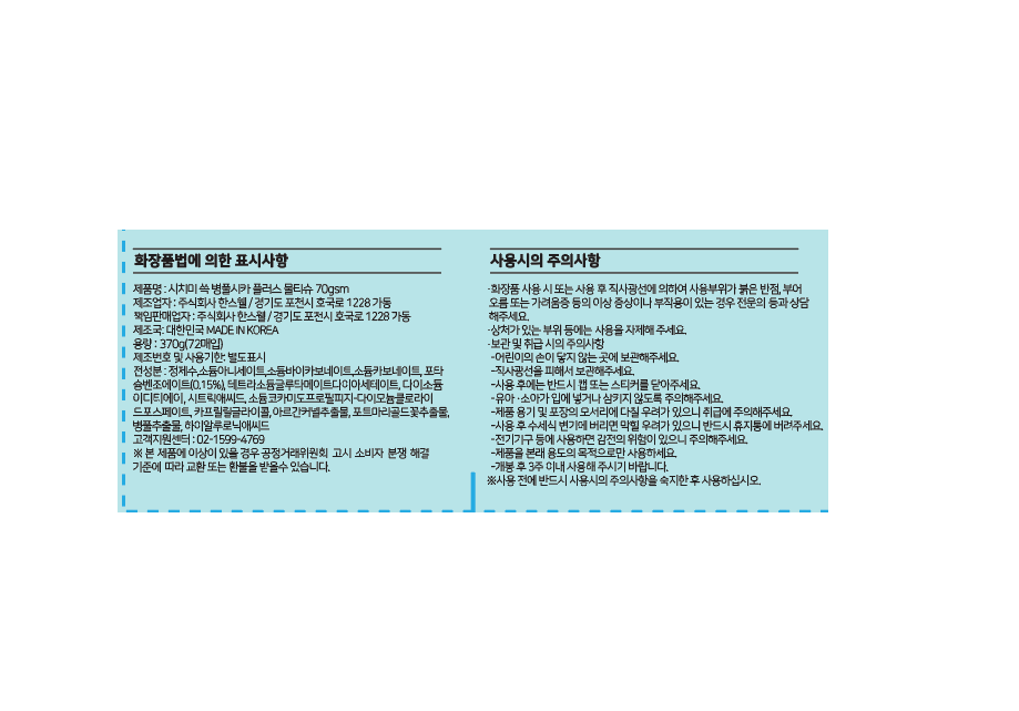 | 사용기한 또는 개봉 후 사용기간 | 본 상품은 해당 물류센터 직발송 상품인 관계로 제조연월일 및 사용기한 정보가 매번 변경되므로 상단 사용기한 정보를 참고해 주세요. | 사용방법 | 적당량을 뽑아 필요한 부분에 사용하세요 |