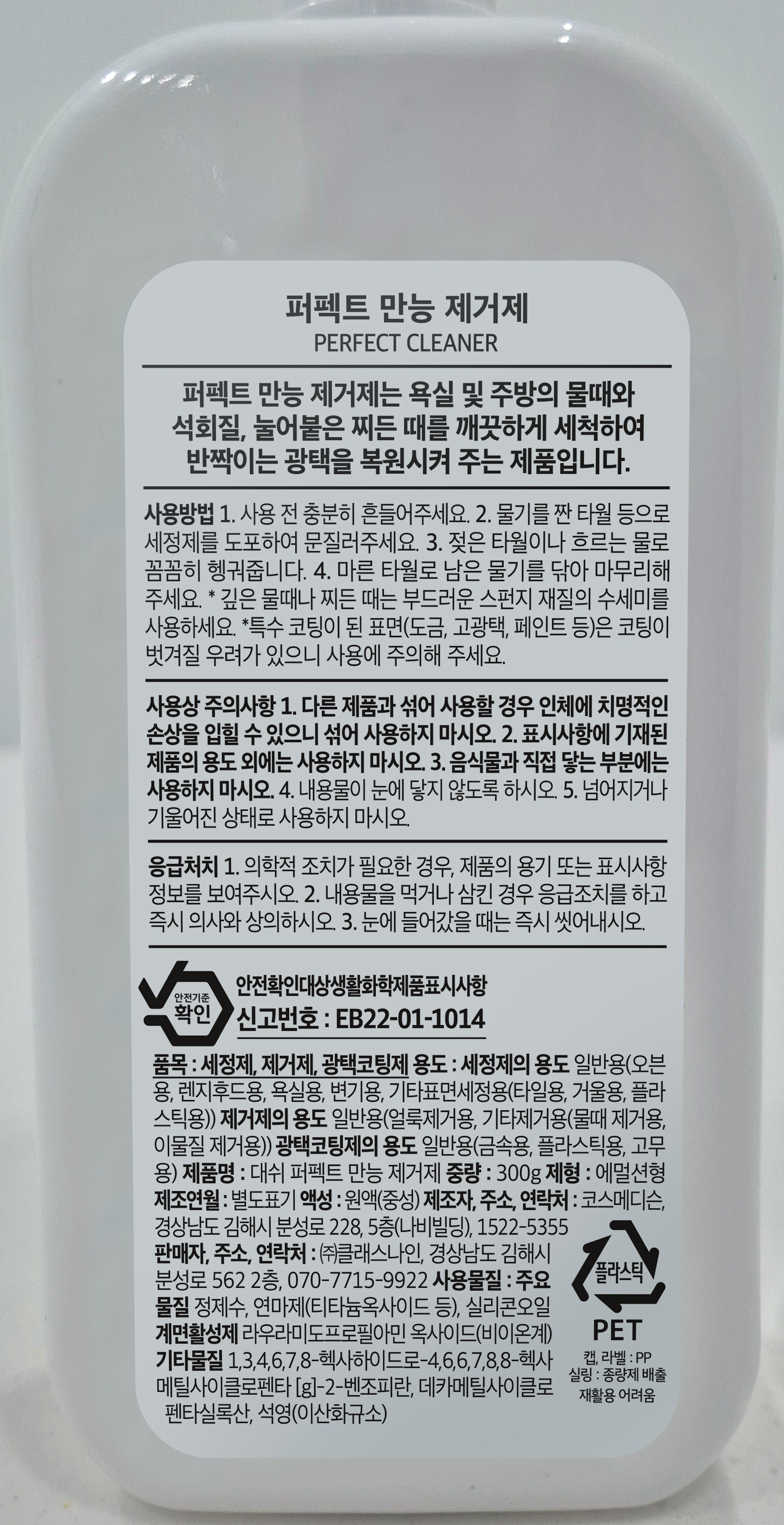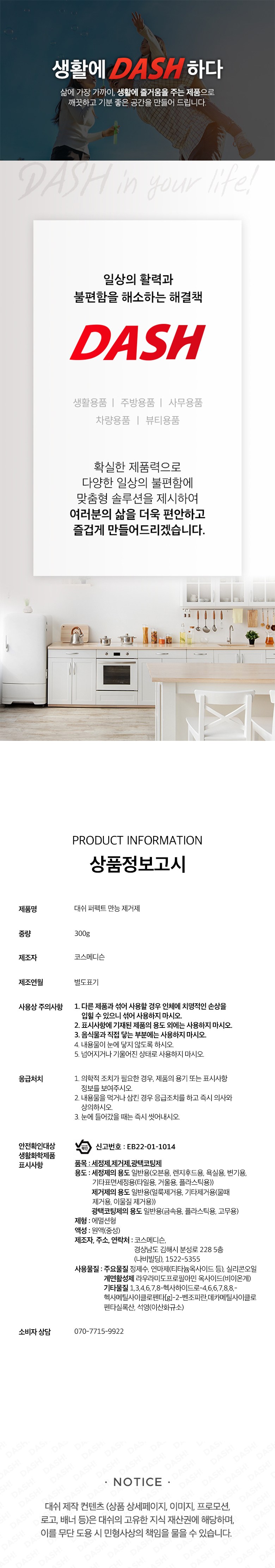 | 품목 및 제품명 | 제거제,세정제,광택코팅제 / 대쉬 퍼펙트 물때 제거제 | 용도(표백제의 경우 계열을 함께표시) 및 제형 | 일반용-기타제거용-물때 제거용, 이물질 제거용,일반용-얼룩제거용,일반용-오븐용,일반용-렌지후드용,일반용-욕실용,일반용-변기용,일반용-기타표면세정용-타일용, 거울용, 플라스틱용,일반용-고무용,일반용-플라스틱용,일반용-금속용 / 비분사형-에멀션형 |