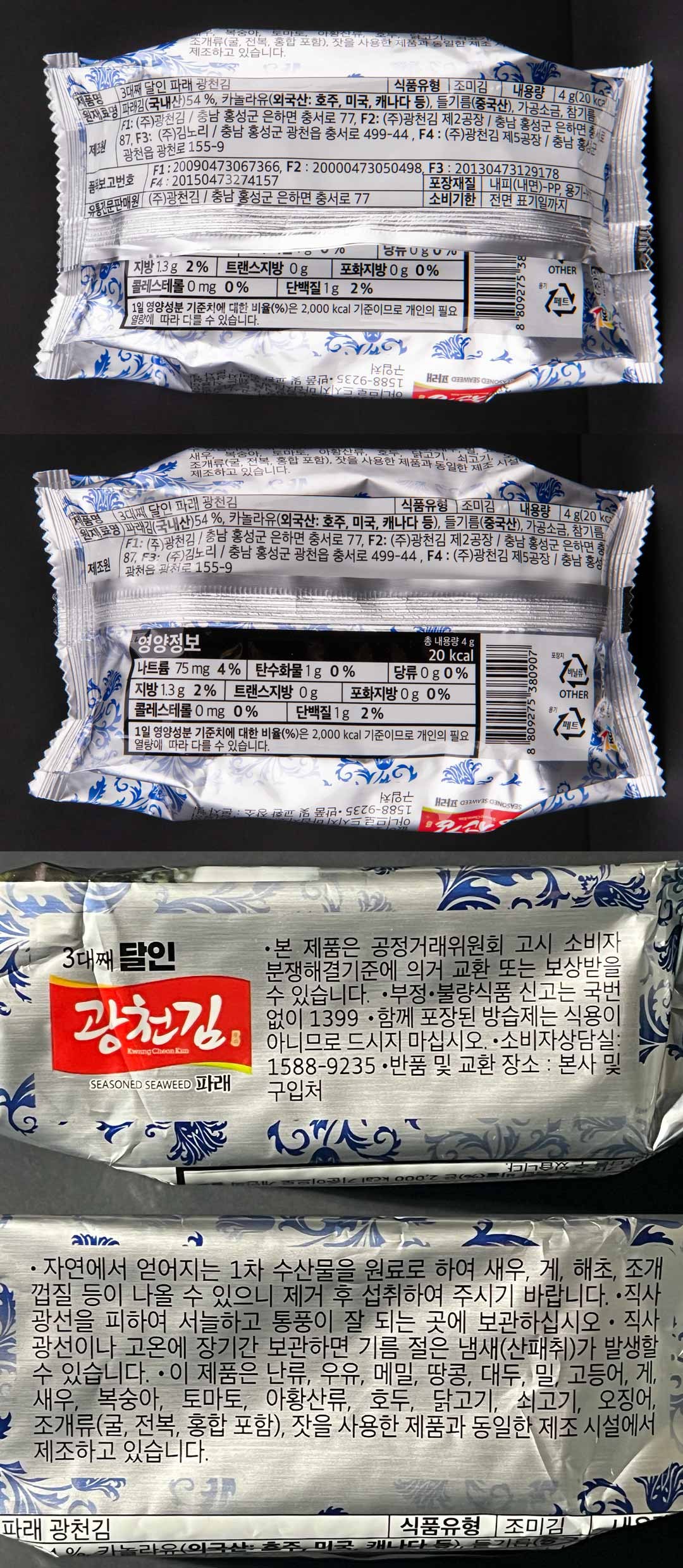 | 제품명 | 들기름을 발라 더 고소한 달인 김병만의 파래 광천김 | 식품의 유형 | 조미김 |