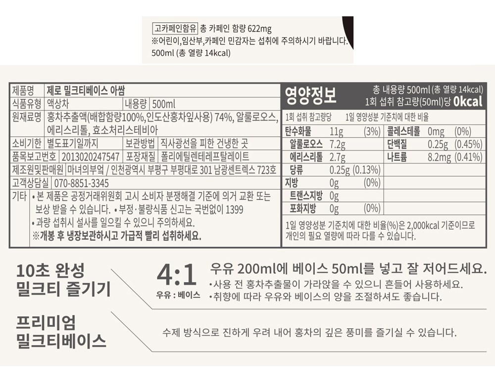 2. 우유와 제로 밀크티베이스를 4:1 비율로 희석하여 드세요.