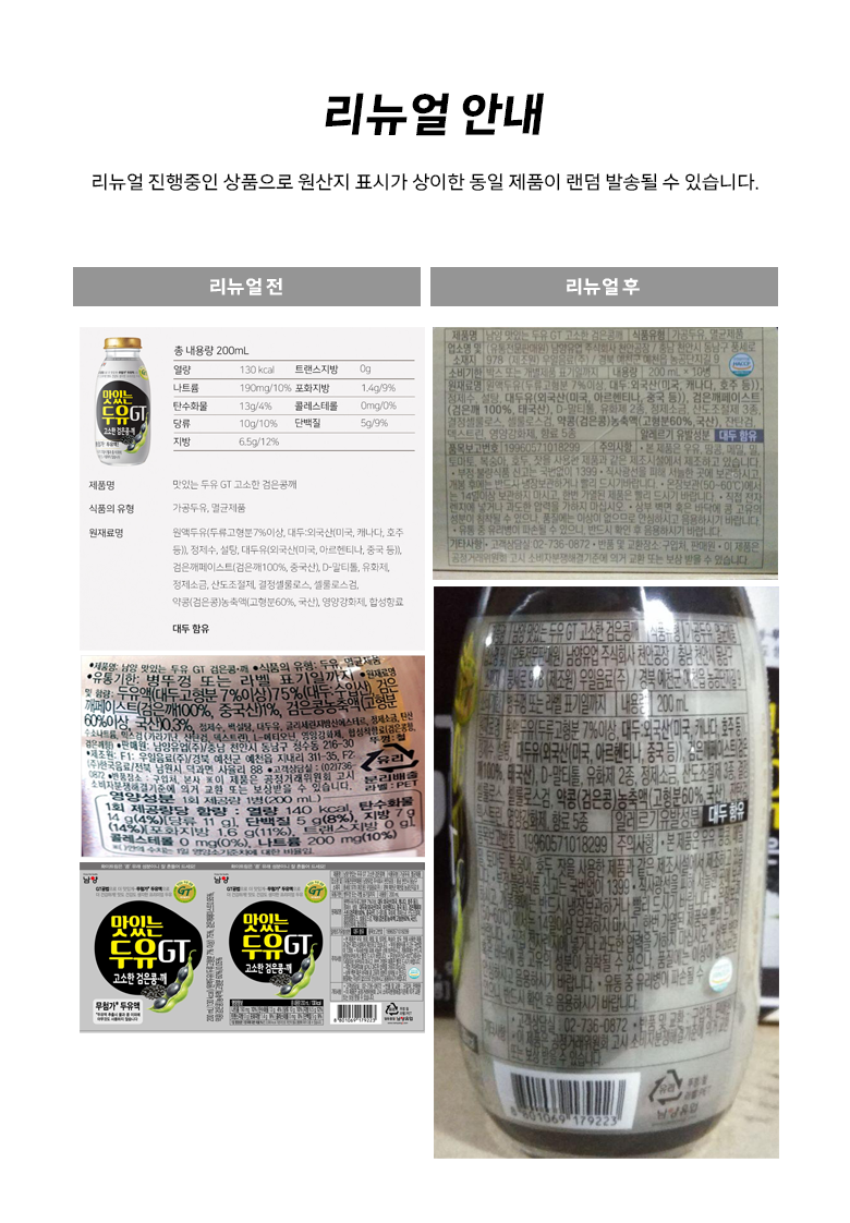 | 제품명 | 남양 맛있는 두유 GT 검은콩 깨 | 식품의 유형 | 컨텐츠참조 |