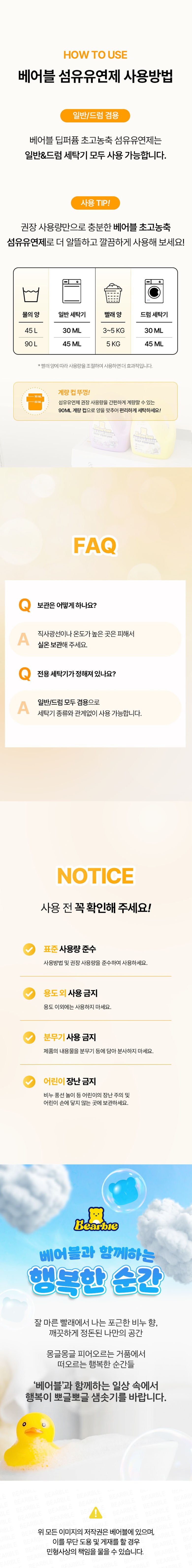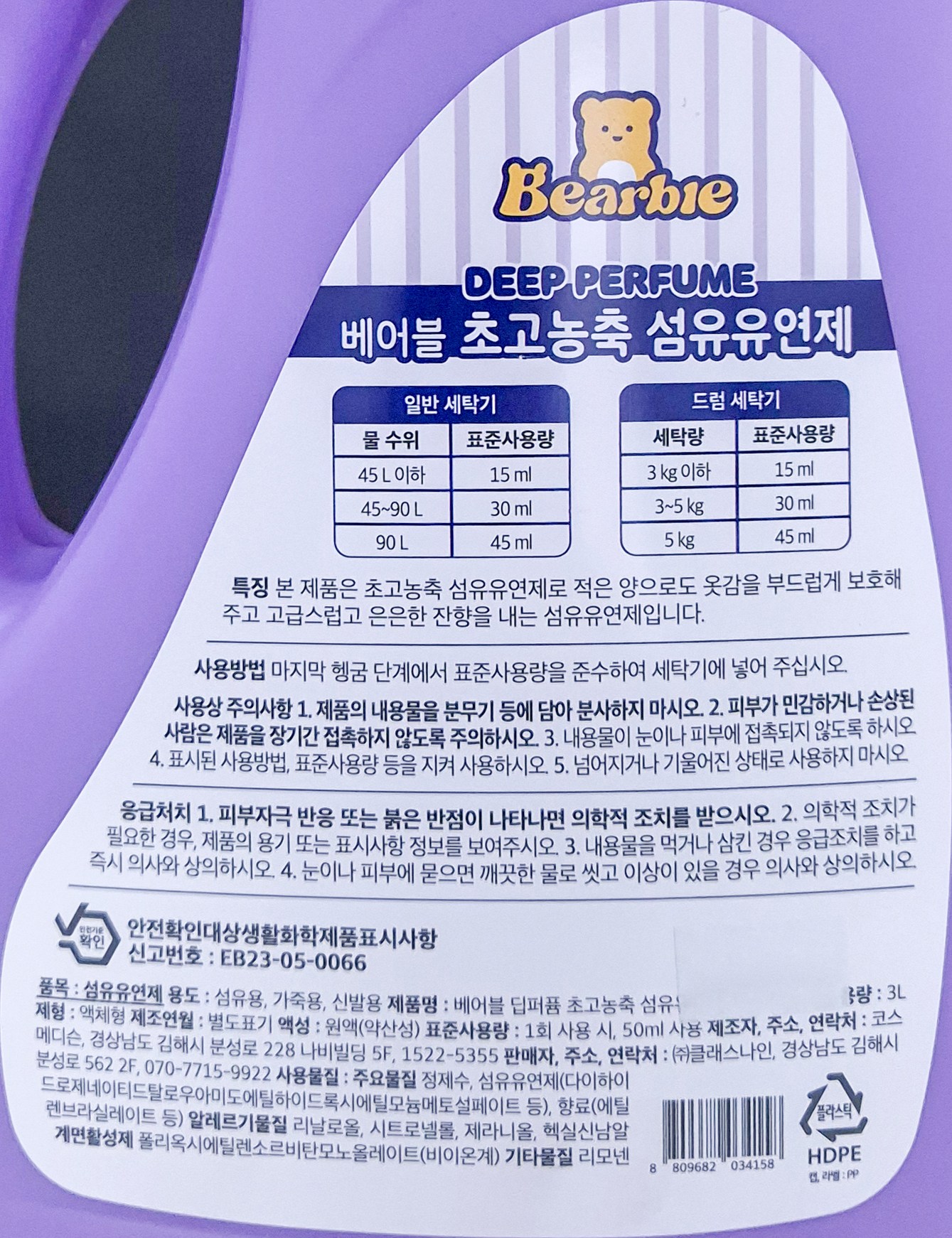 | 품목 및 제품명 | 섬유유연제 / 베어블 딥퍼퓸 초고농축 섬유유연제 아이리스 퍼플 | 용도(표백제의 경우 계열을 함께표시) 및 제형 | 섬유용,가죽용,신발용 / 액체형 |