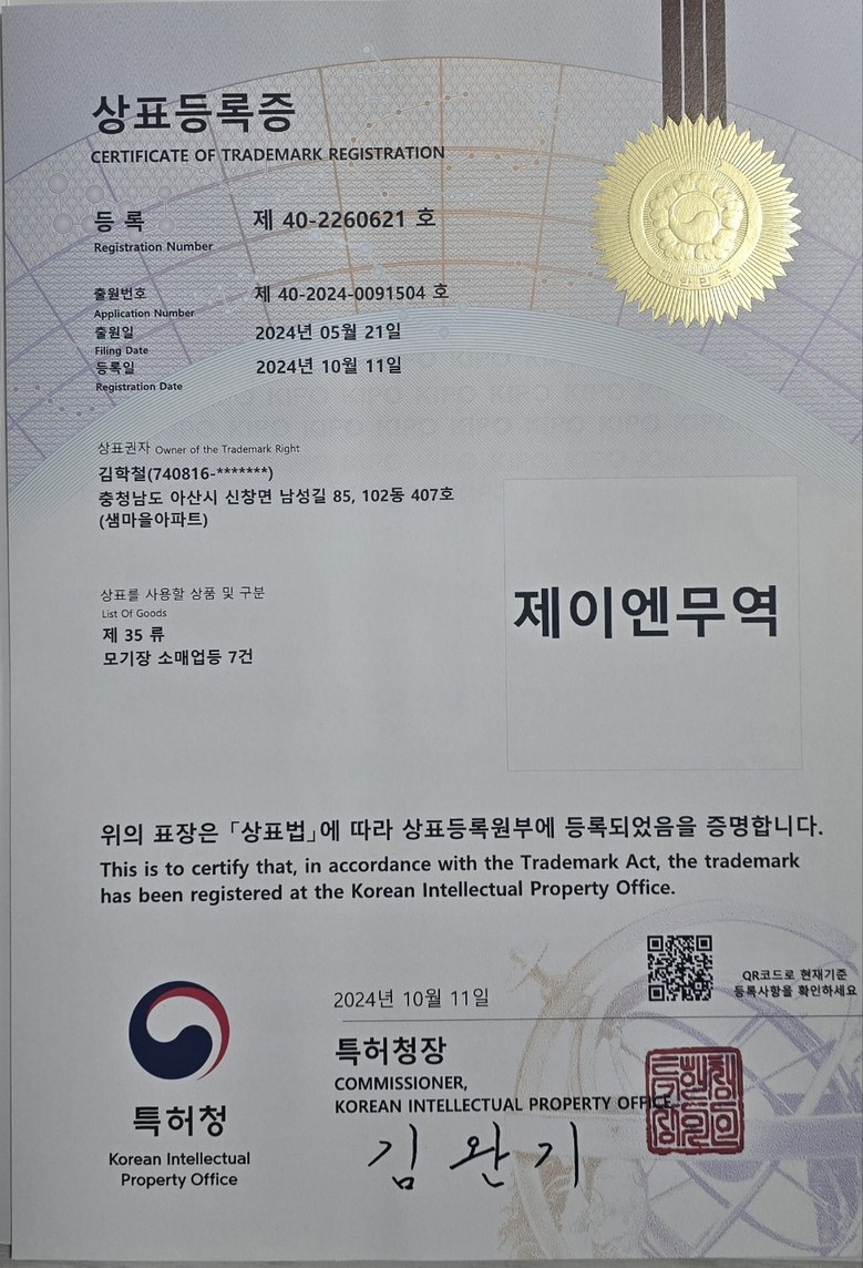 상호/대표자 | 제이엔 홈 / JIN XUEZHE | 사업장 소재지 | 인천광역시 서구 봉오대로318번길 23 (가정동, 하나아파트) 205동 1101호 |