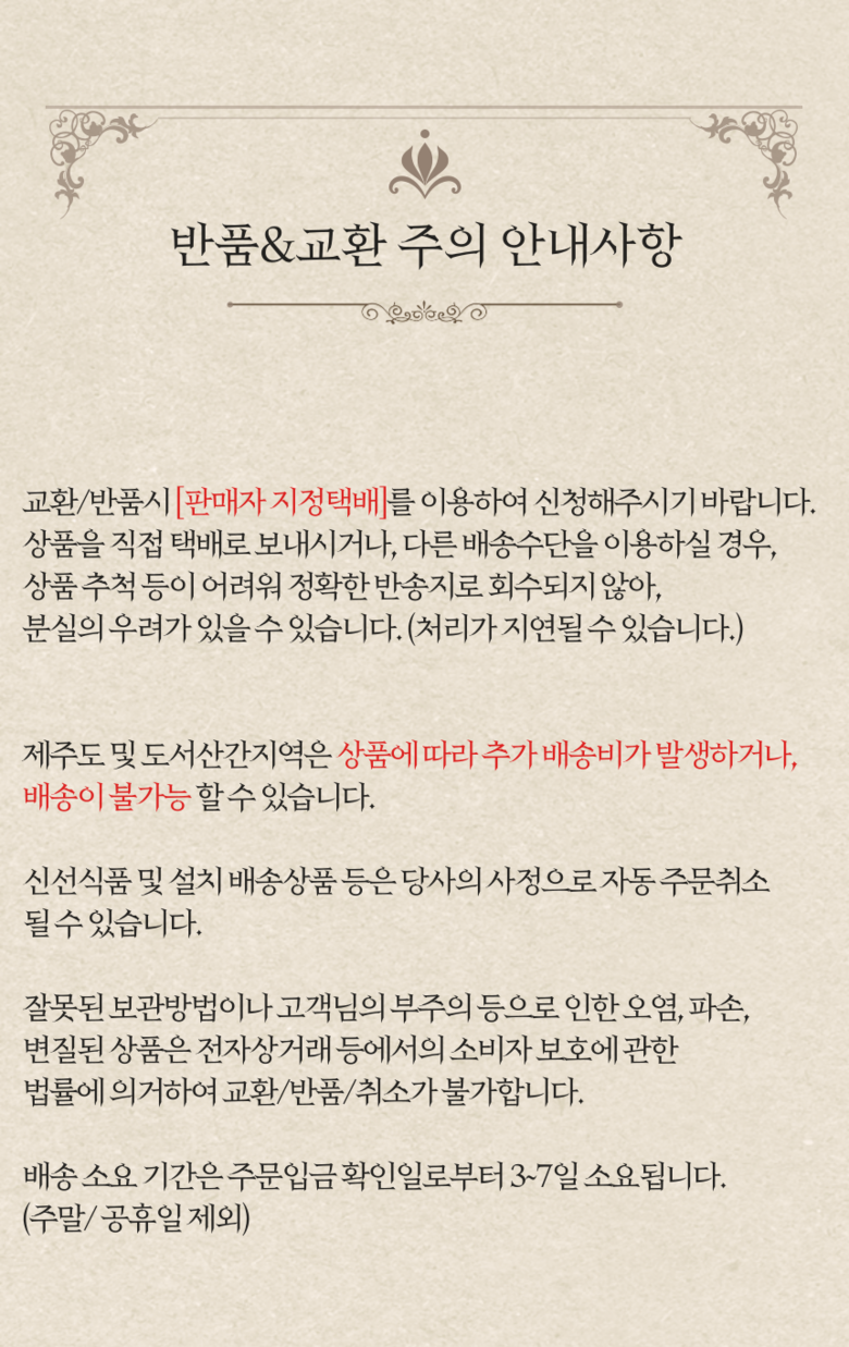 - ㆍ교환/반품에 관한 일반적인 사항은 판매자가 제시사항보다 관계법령이 우선합니다.