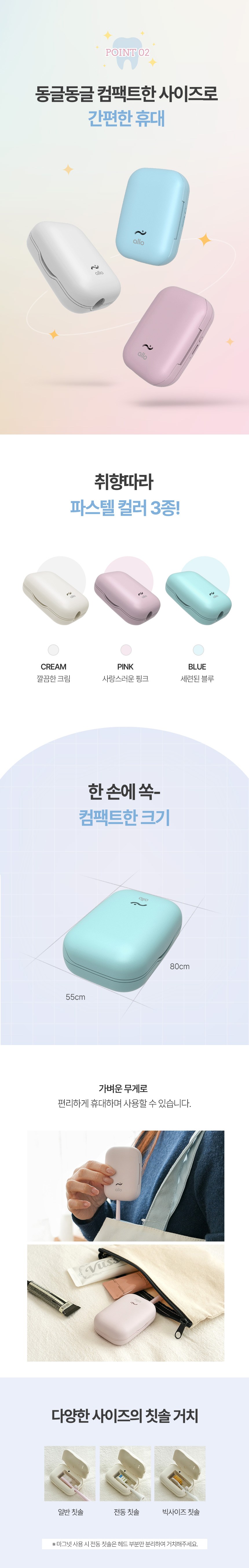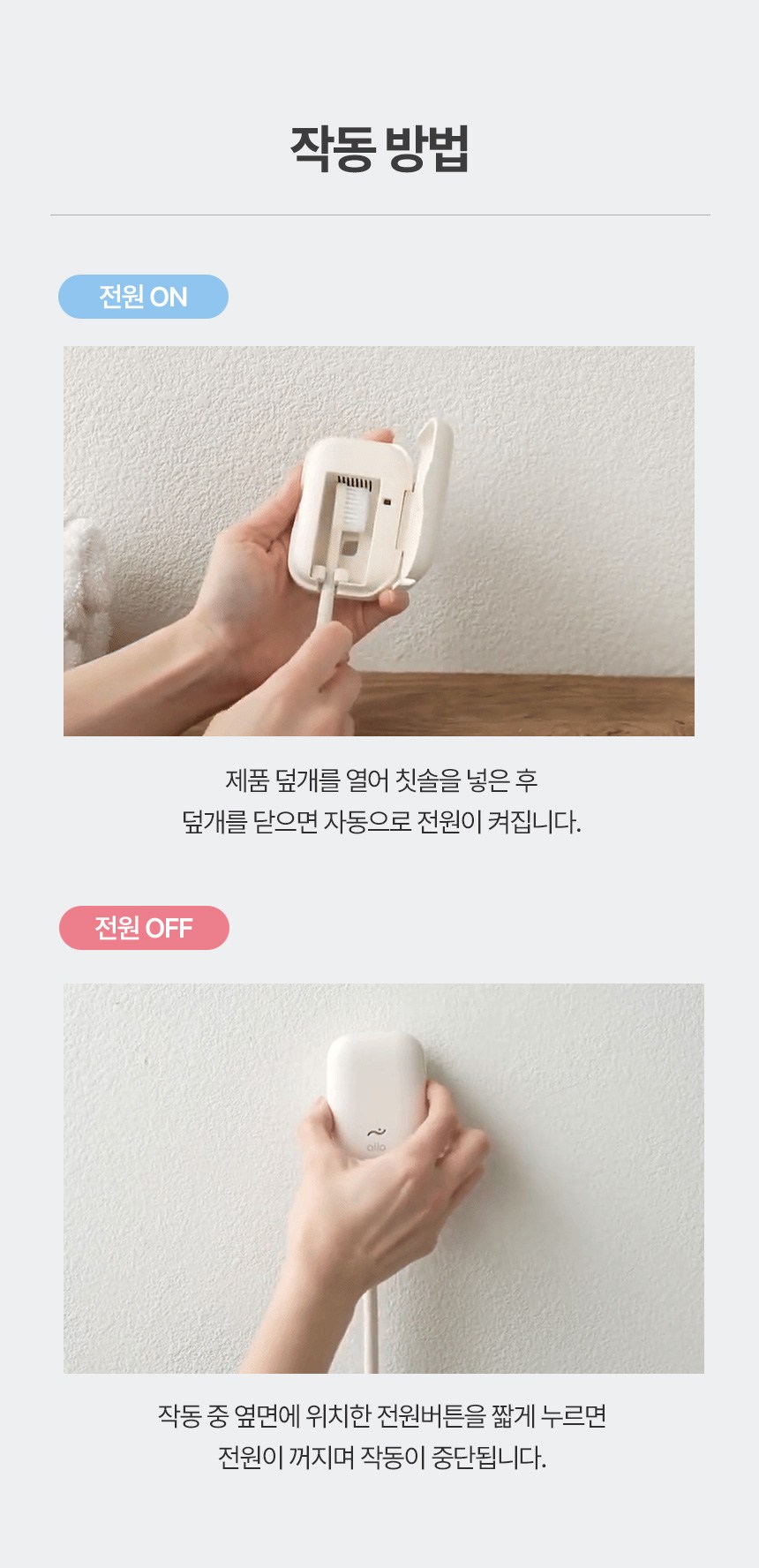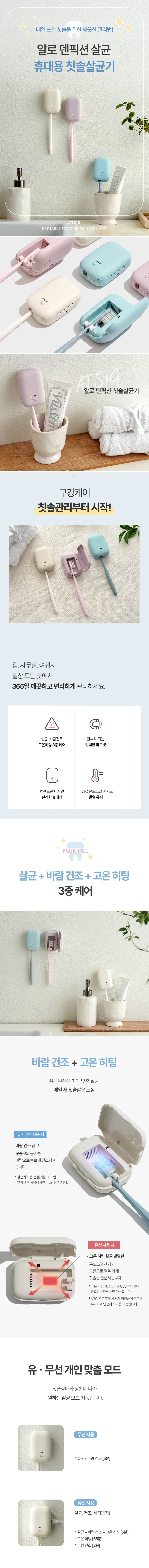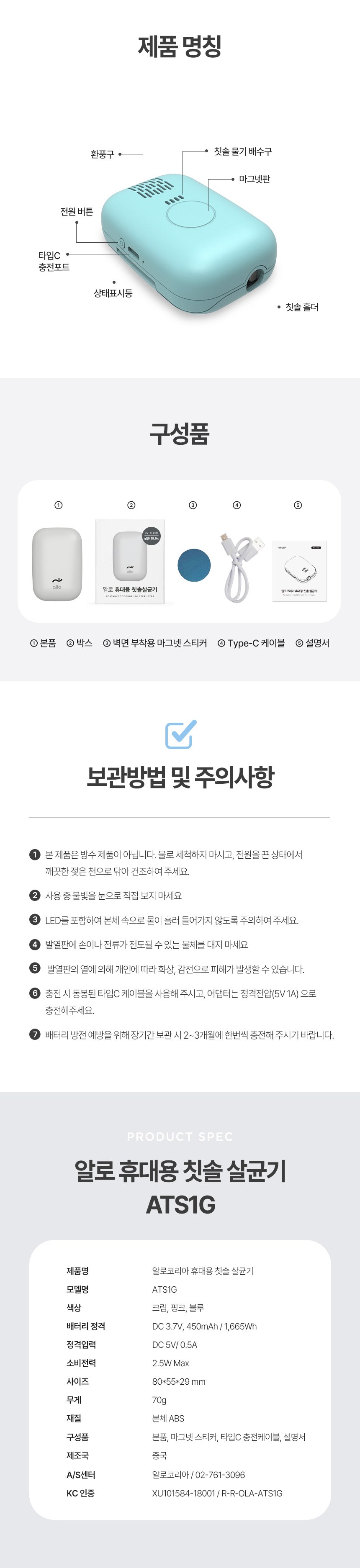 | 품명 및 모델명 | 알로코리아 휴대용 칫솔살균기 / ATS1G | KC 인증정보 | 본품: R-R-OLA-ATS1G / 전지: XU101584-18001A |