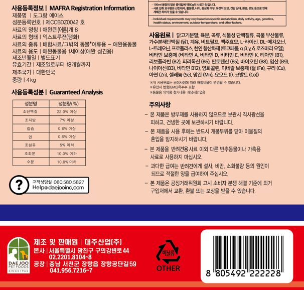 | 품명 및 모델명 | 도그랑 에이스 | 인증/허가 사항 | 사료관리법에 따른 성분등록번호 : 컨텐츠 참조 |