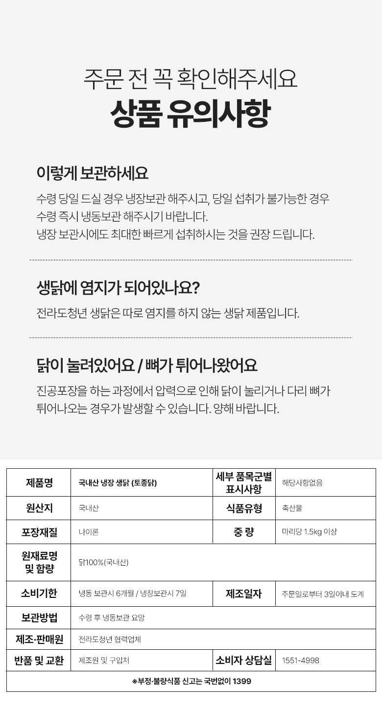 품목 또는 명칭국내산 잘키운 토종닭 삼계닭 백숙용 생닭포장단위별 내용물의 용량(중량),수량,크기1.5kg,1개,2개,3개