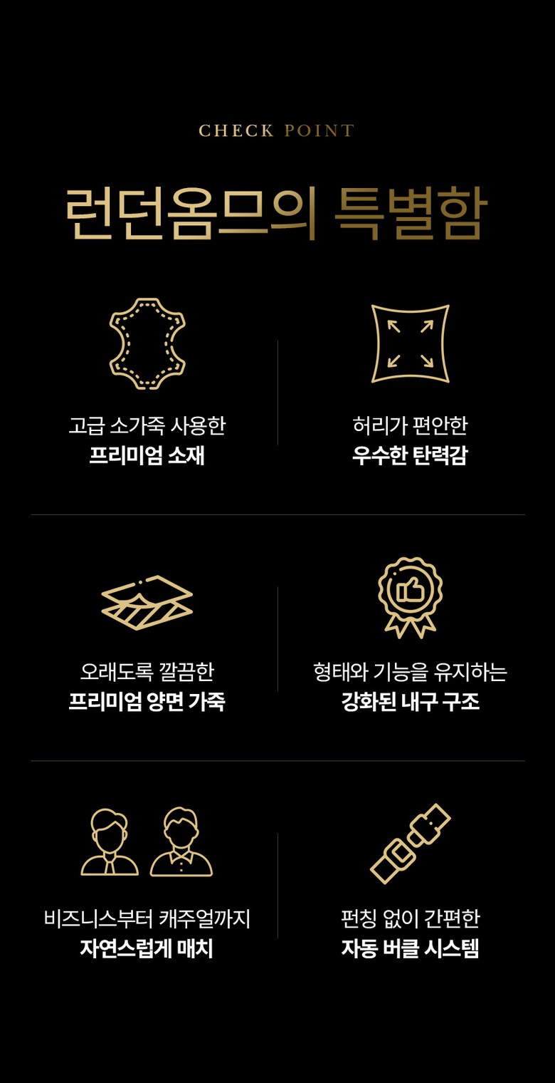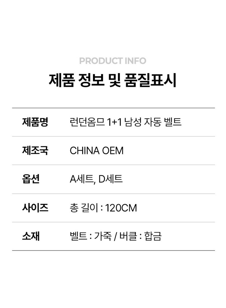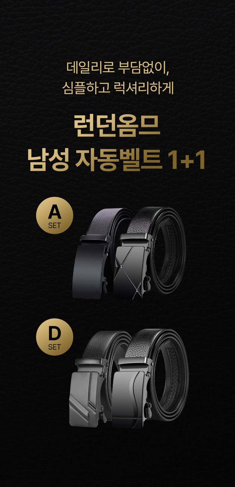 | 종류 | 런던옴므 1+1 남성 자동 벨트 가죽 허리띠 | 소재 | PU 에코레더 |