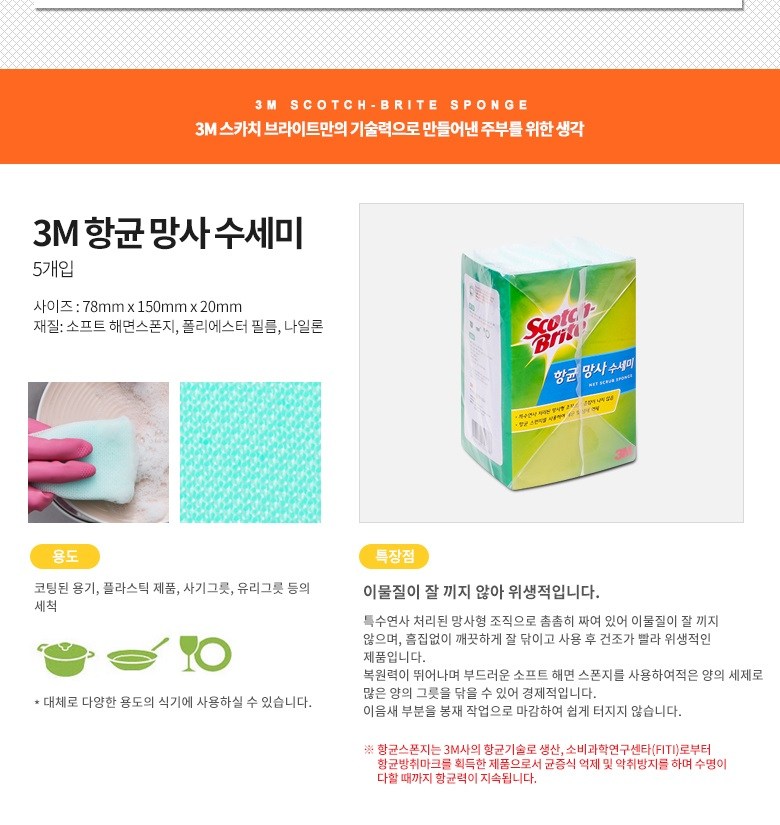 | 품명 및 모델명 | 향균 망사 수세미(1개입) x 5입 | 재질 | 소프트 해면 스폰지, 폴리에스터 필름, 나일론 |