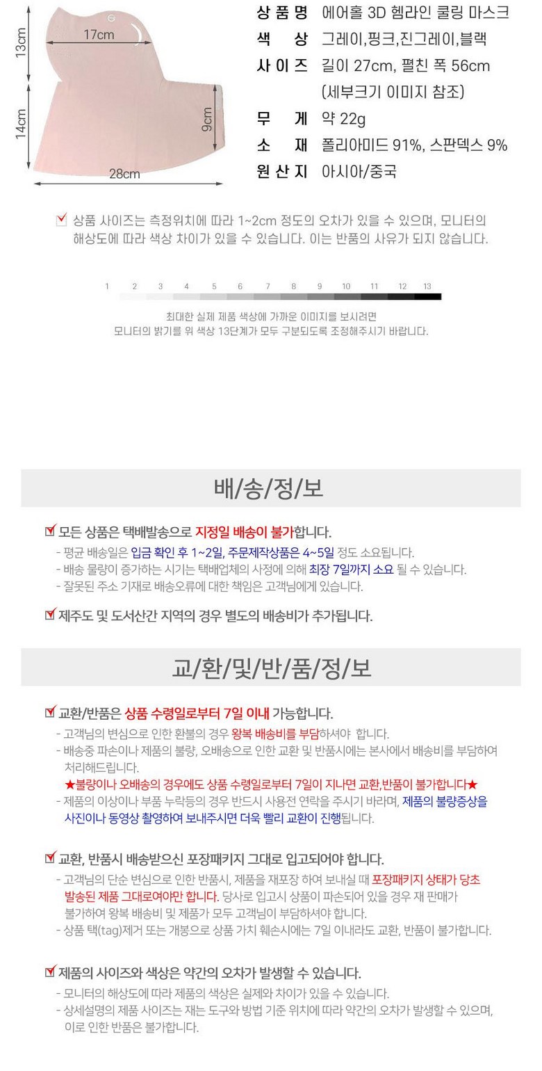 - ㆍ모니터 해상도의 차이로 인해 색상이나 이미지가 실제와 달라, 고객이 단순 변심으로 교환/반품을 무료로 요청하는 경우