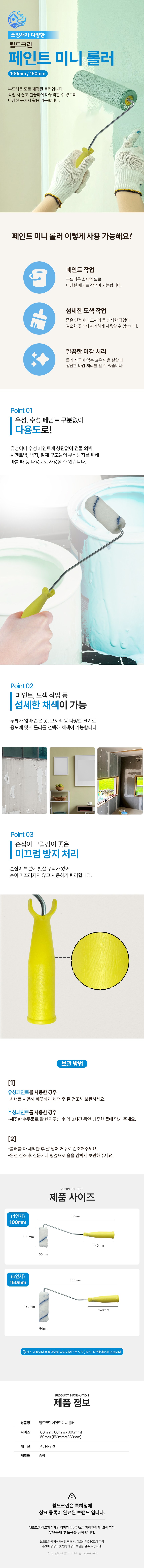 | 품명 및 모델명 | 월드크린 페인트 미니 롤러 150mm 3개 | 인증/허가 사항 | 해당없음 |