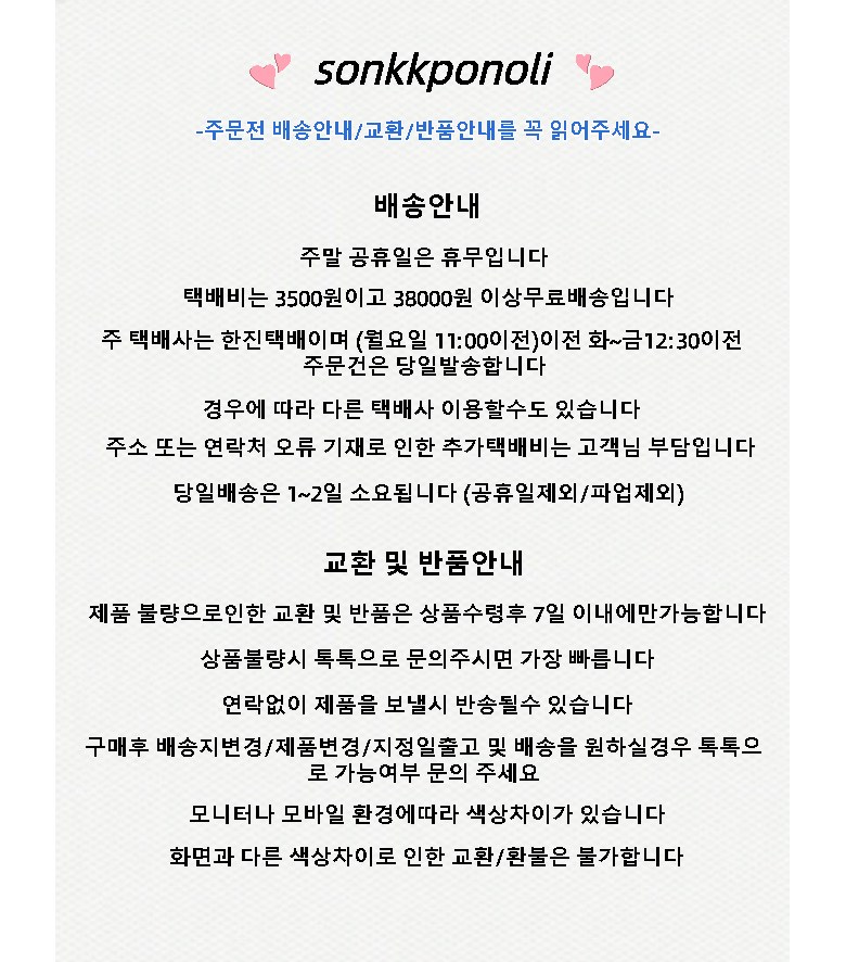 - ㆍ모니터 해상도의 차이로 인해 색상이나 이미지가 실제와 달라, 고객이 단순 변심으로 교환/반품을 무료로 요청하는 경우