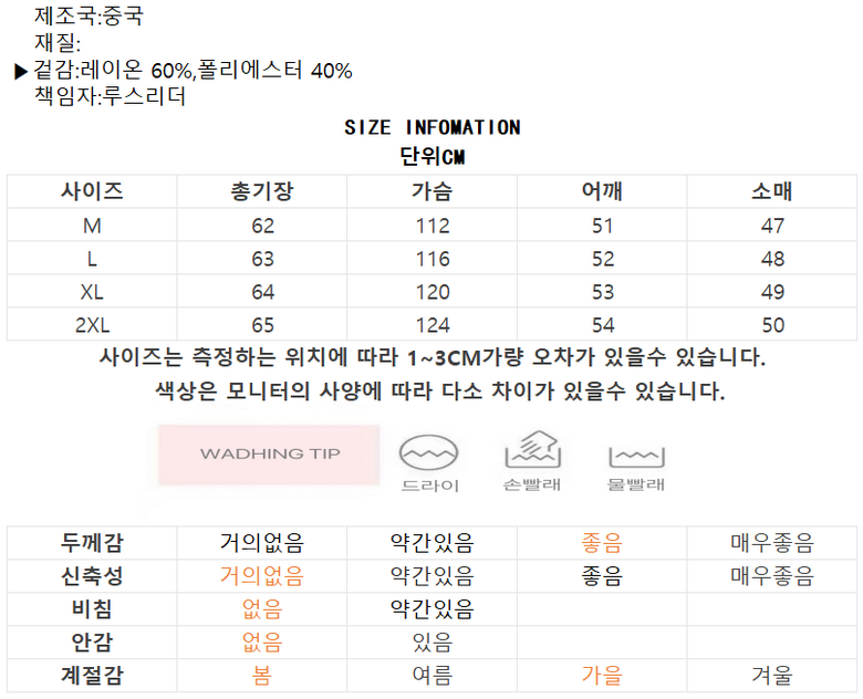 | 제조국 | 중국 | 세탁방법 및 취급시 주의사항 | 상품 상세페이지 참조 |