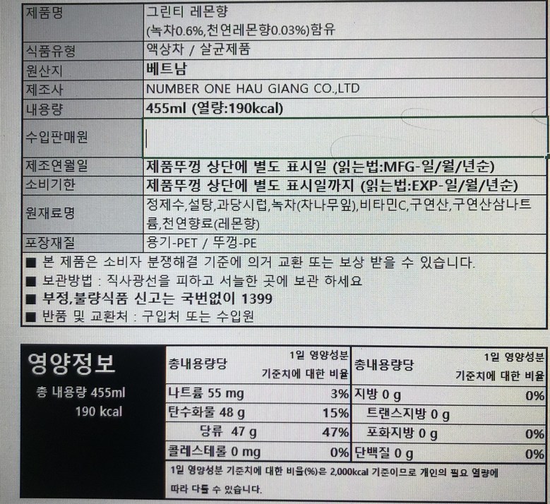 | 품목 또는 명칭 | 그린녹차음료 차산콩도 | 포장단위별 내용물의 용량(중량),수량,크기 | 상품 상세페이지 참조 |