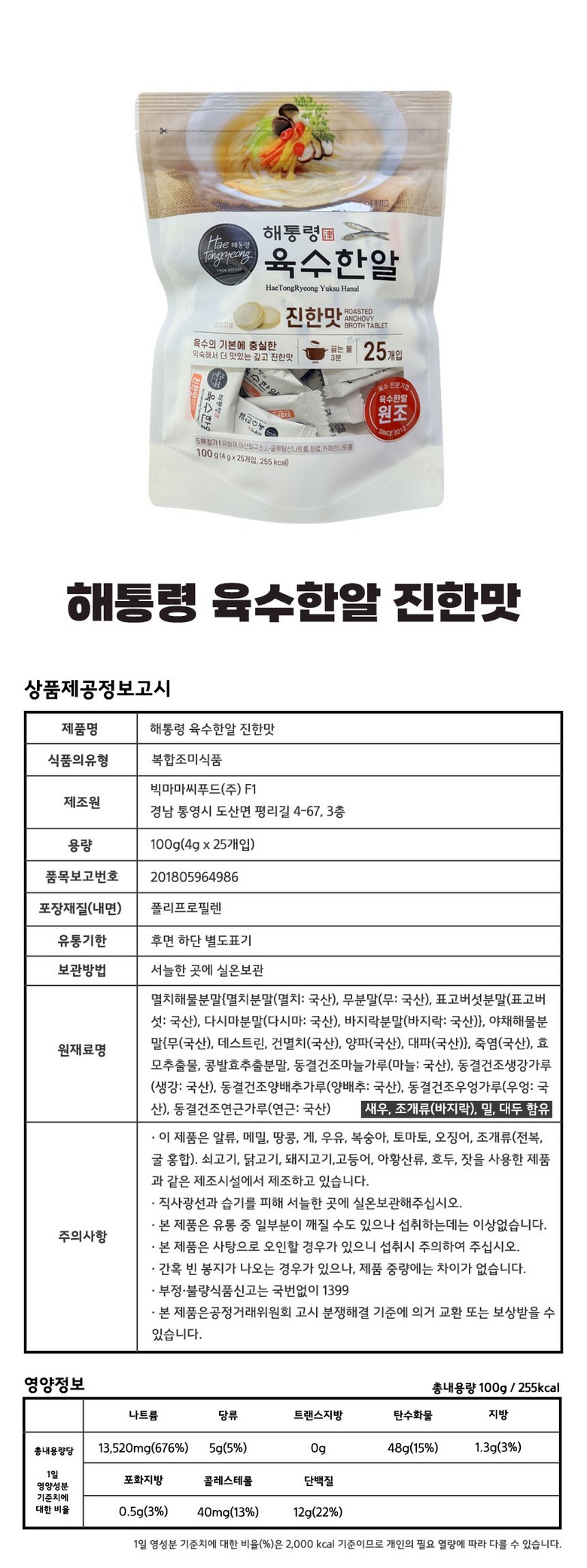 | 제품명 | 해통령 육수한알 진한맛 100g x 8개 | 식품의 유형 | 상품 상세페이지 참조 |