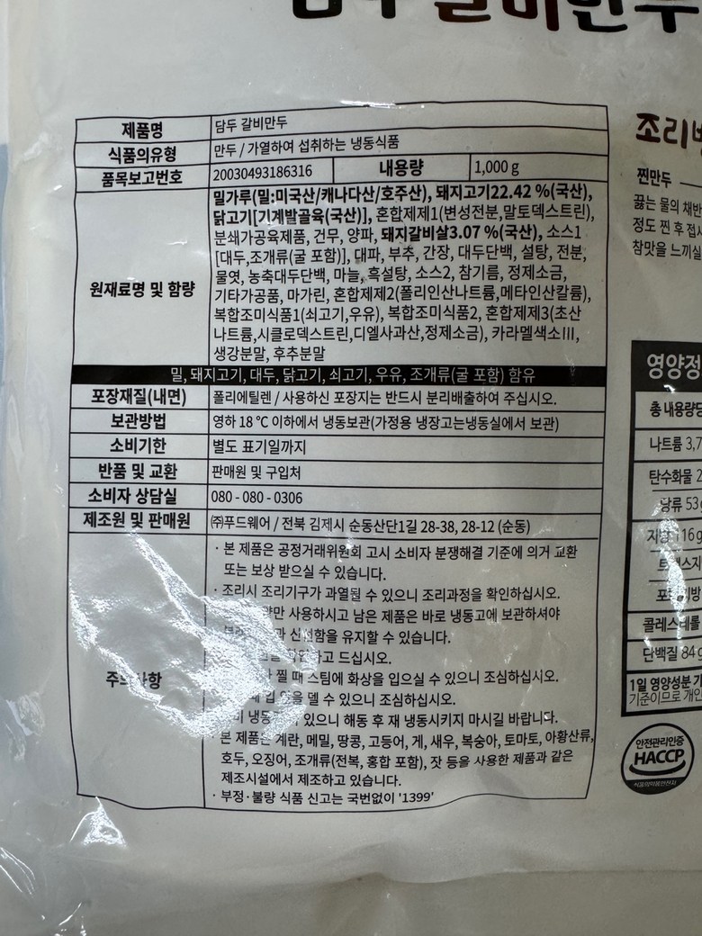| 품목 또는 명칭 | 담두 갈비만두 1kg | 포장단위별 내용물의 용량(중량),수량,크기 | 상품 상세페이지 참조 |