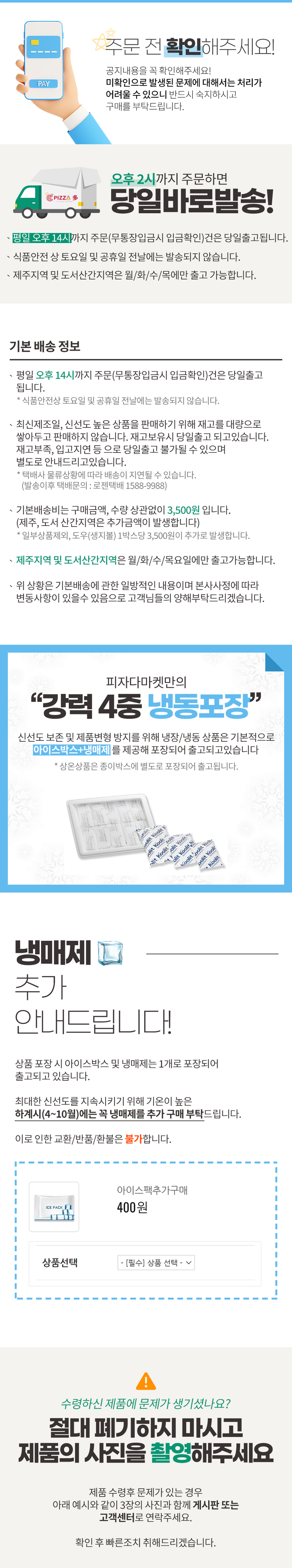 | 배송방법 | 신선/냉장/냉동 | 배송비 | 3,500원 · 도서산간 추가 배송비 - 제주 지역: 5,000원 - 도서산간 지역: 5,000원 |