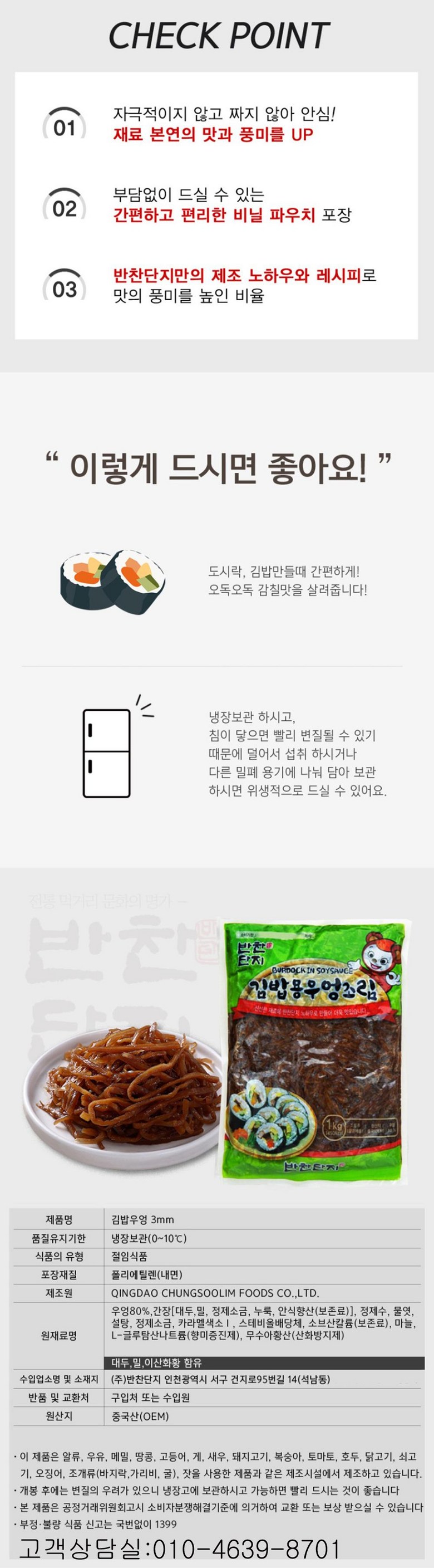 | 생산자 및 소재지 | QINGDAO CHUNGSOOLIM FOODS CO.,LTD(중국)/수입원:반찬단지/인천시 서구 북항로28-29 | 제조연월일, 소비기한 또는 품질유지기한 | 제조연월일:2024년7월 이후 생산된 제품으로 순차적배송 |