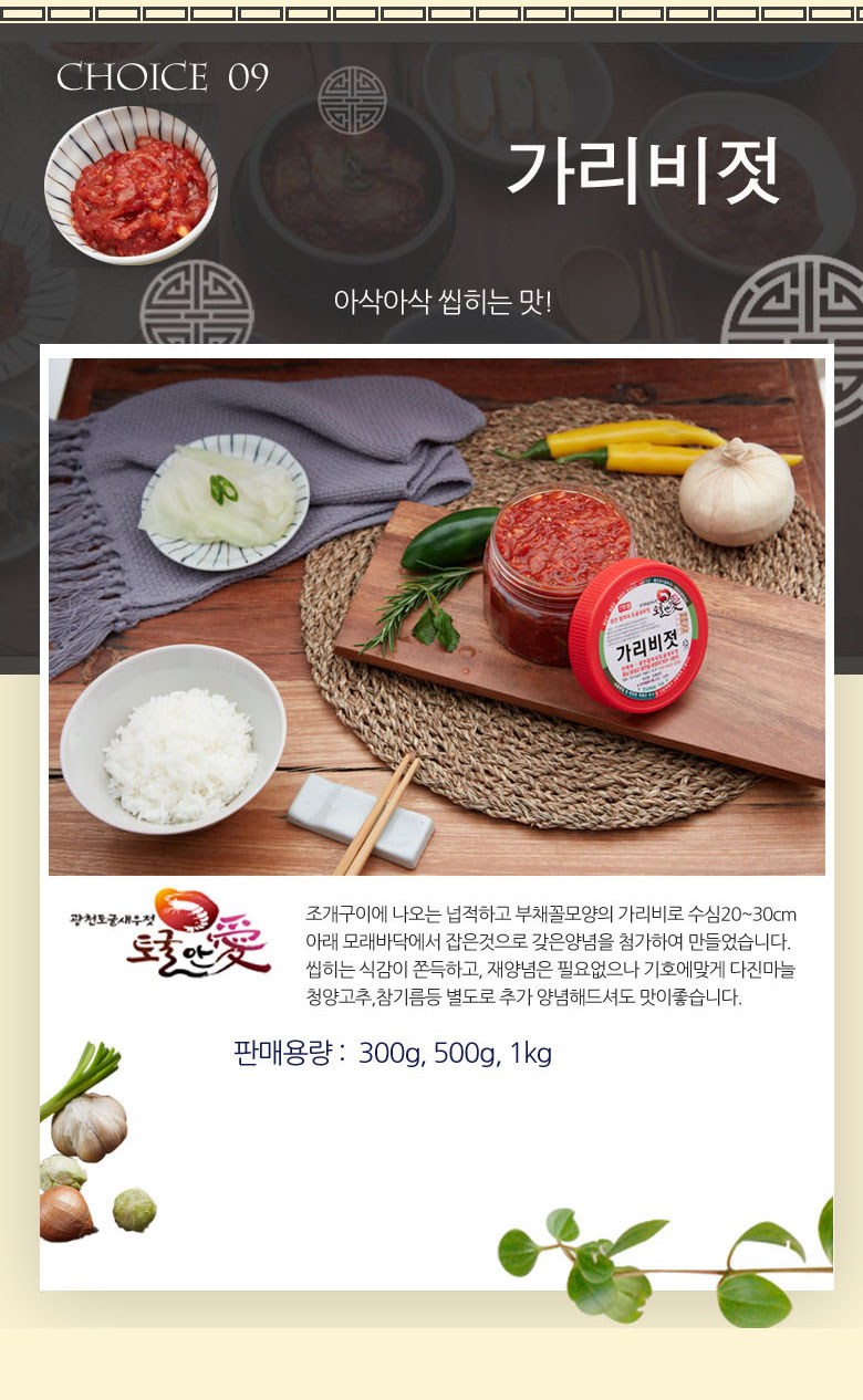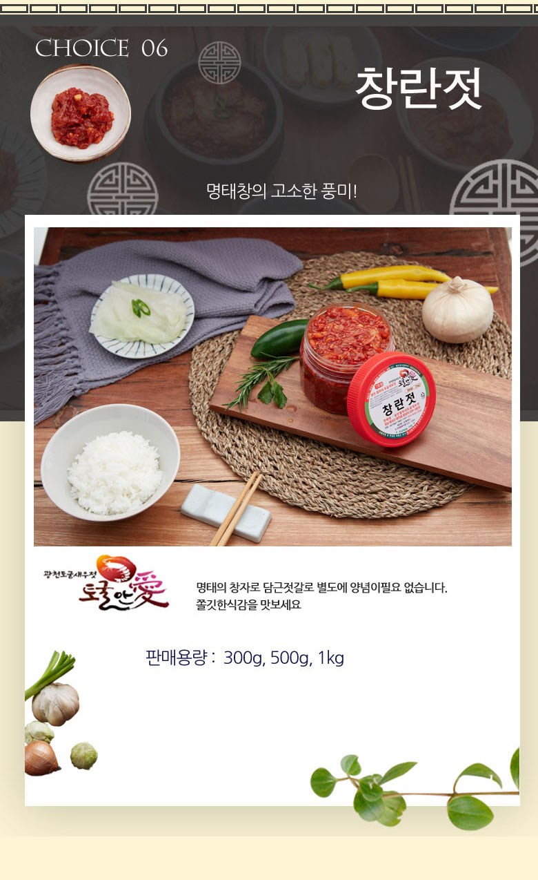 | 국내산 : 오징어젓, 멍게젓, 갈치속젓, 밴댕이젓, 어리굴젓 |