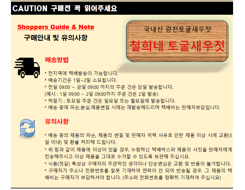 | 좋구요, 받는즉시 냉장보관 하시고 빨리 드시기를 권장합니다. 짜다는 이유로 반품/환불/교환이 불가하니 신중히 생각하시여 |