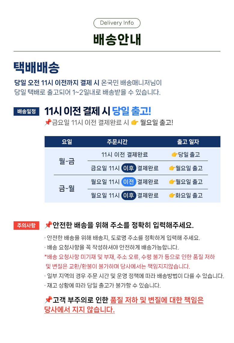 | 배송기간 | ㆍ도서산간 지역 등은 배송에 3-5일이 더 소요될 수 있습니다. - 천재지변, 물량 수급 변동 등 예외적인 사유 발생 시, 다소 지연될 수 있는 점 양해 부탁드립니다. | ||