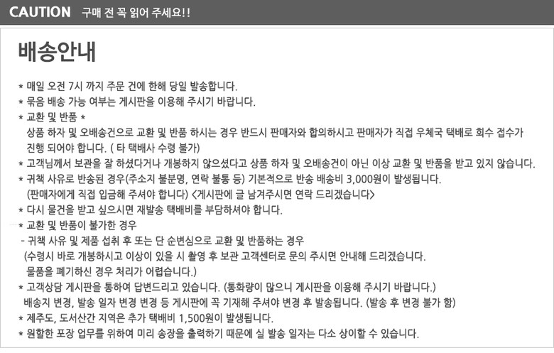 | 교환/반품 비용 (왕복비용) | 7,000원 - 단, 고객 변심의 경우에만 발생 - 도서산간 및 일부 지역 추가비용 발생 |