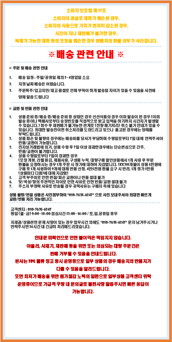 - ㆍ교환/반품에 관한 일반적인 사항은 판매자가 제시사항보다 관계법령이 우선합니다.