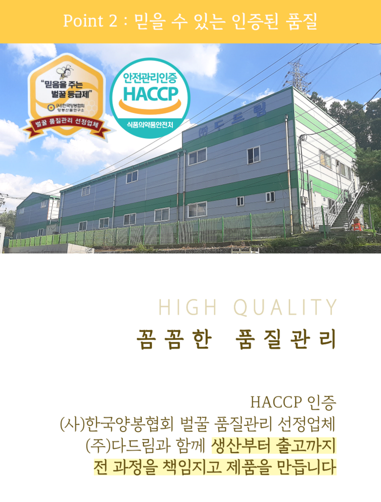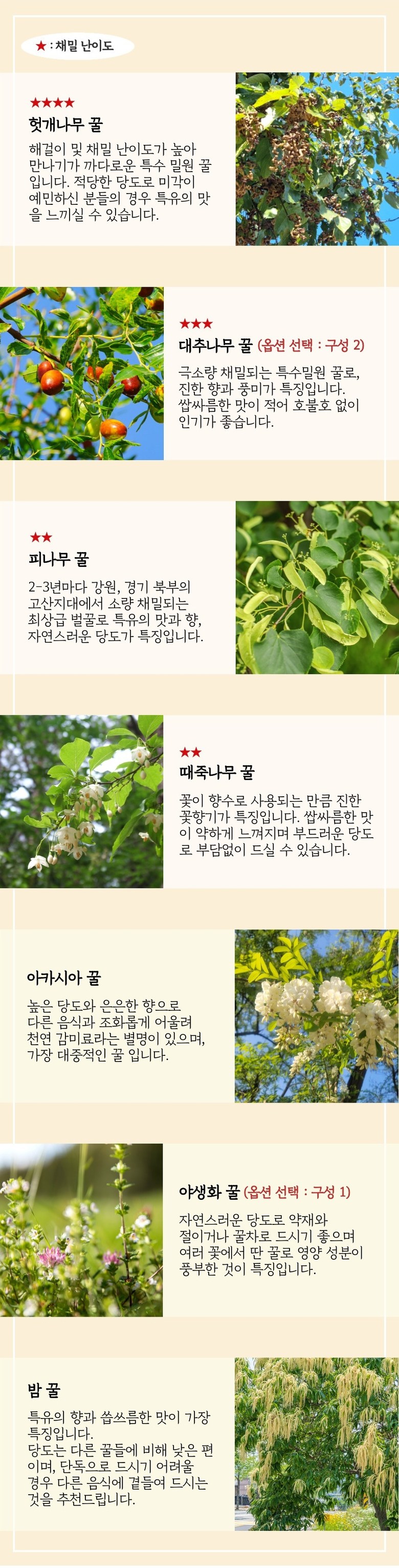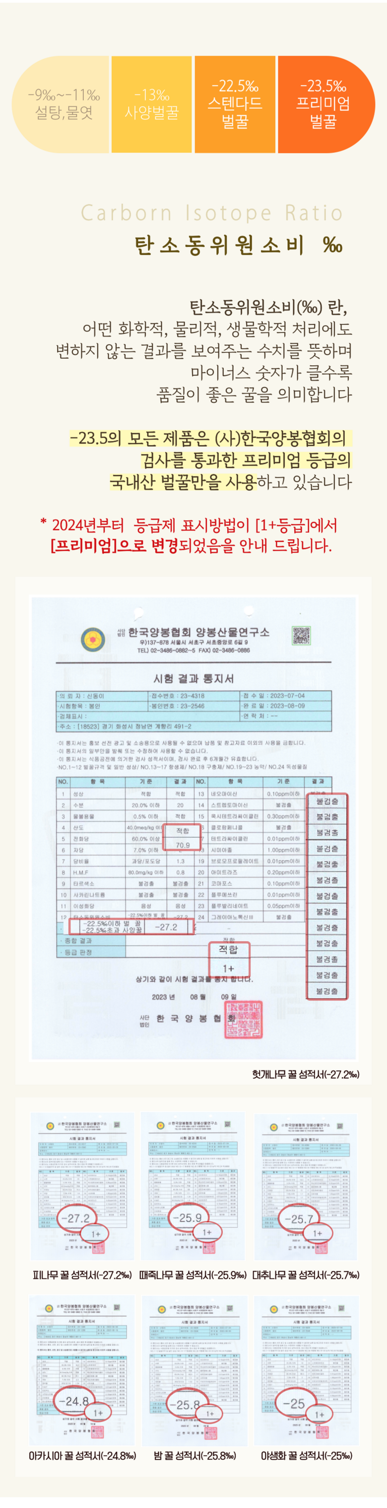 | 제조연월일, 소비기한 또는 품질유지기한 | 소비기한(또는 유통기한) : 2027년 08월 17일 이거나 그 이후인 상품 제조년월일 : 2025년 08월 18일 이후인 제조상품 | 세부 품목군별 표시사항 | (사)한국양봉협회 벌꿀 시험성적서 의뢰 후 프리미엄 등급 판정 제품 |