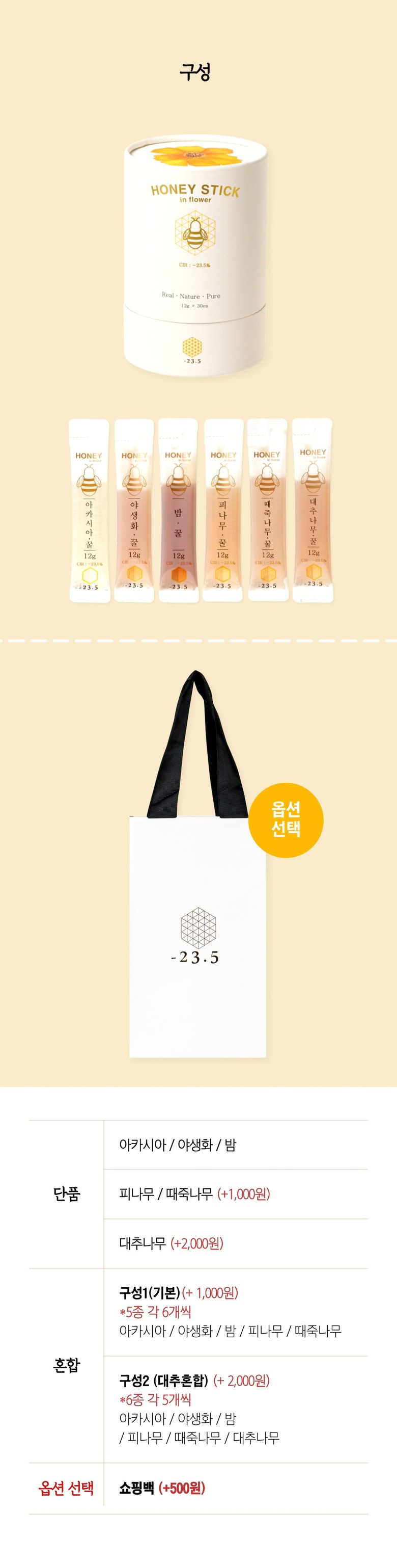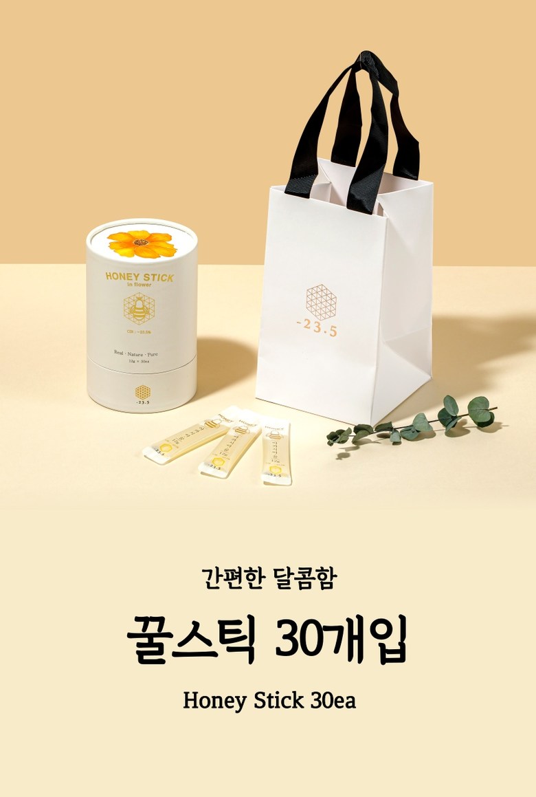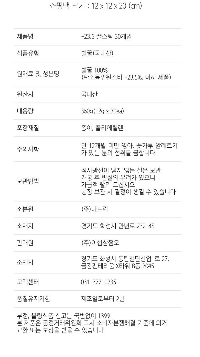| 품목 또는 명칭 | -23.5 꿀스틱 30개입 | 포장단위별 내용물의 용량(중량),수량,크기 | 12g * 30포 (총 360g) |