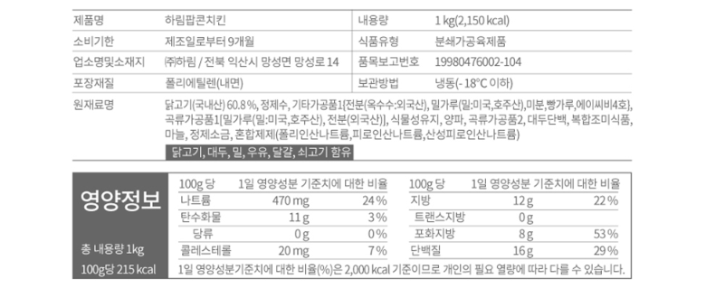 | 제조연월일, 소비기한 또는 품질유지기한 | 상품 상세페이지 참조 | 세부 품목군별 표시사항 | 상품 상세페이지 참조 |