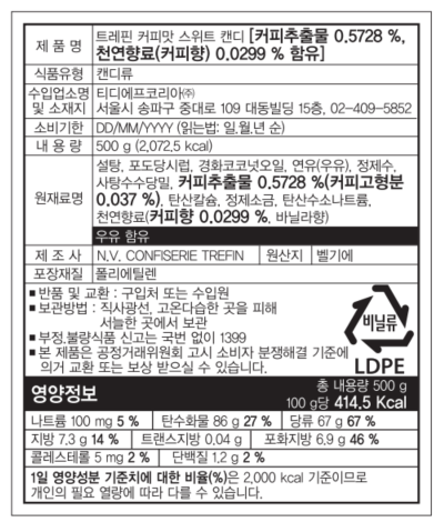 | 제품명 | 트레핀 커피맛 스위트 캔디 | 식품의 유형 | 컨텐츠 참조 |