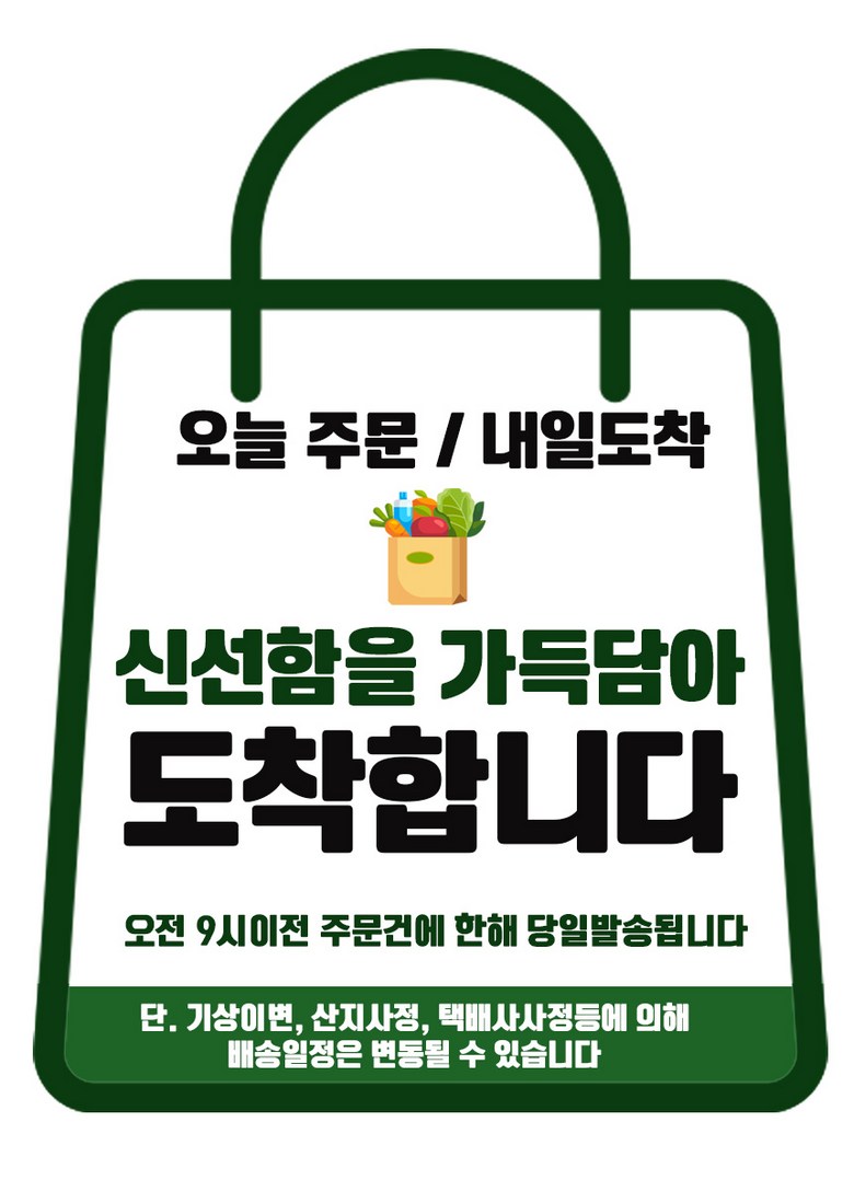 | 배송방법 | 신선/냉장/냉동 | 배송비 | 무료배송 · 도서산간 추가 배송비 - 제주 지역: 400원 - 도서산간 지역: 400원 |