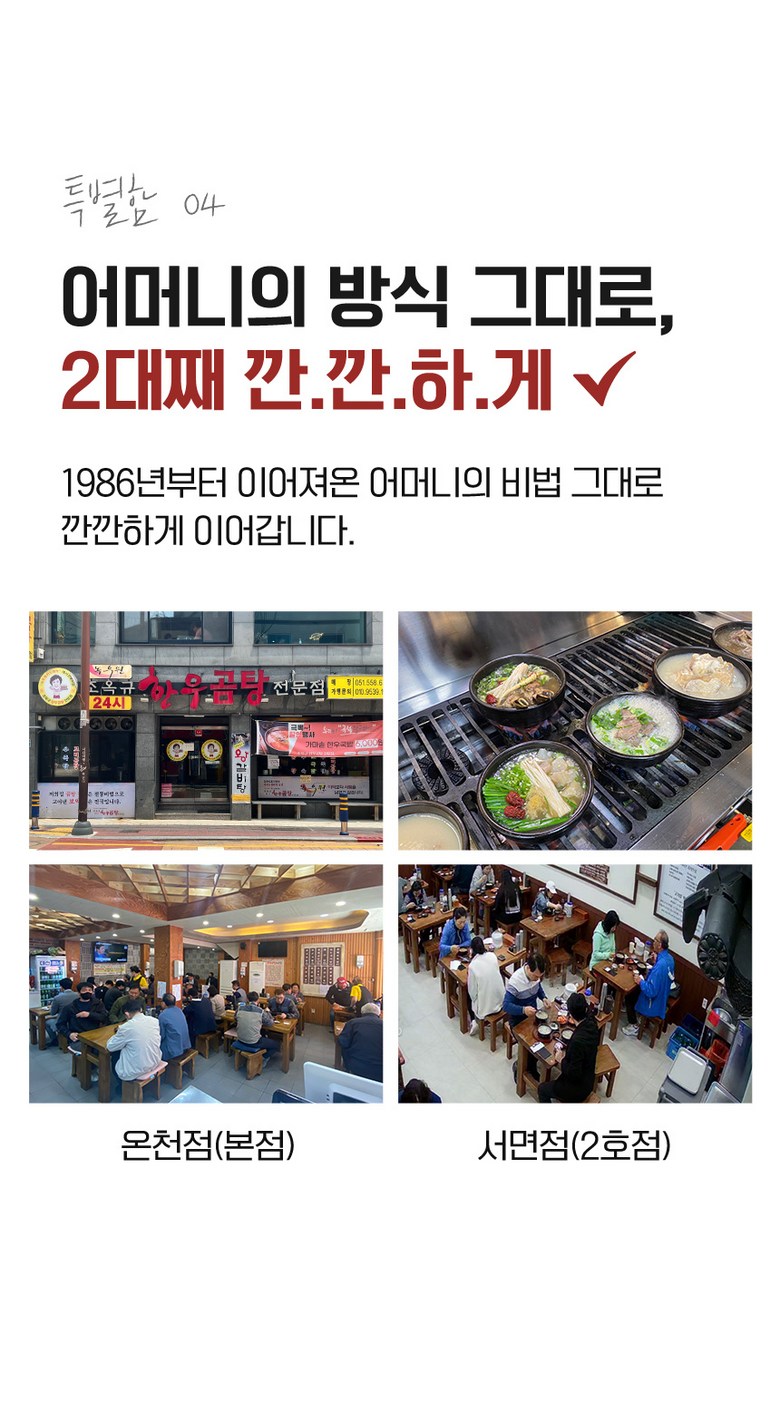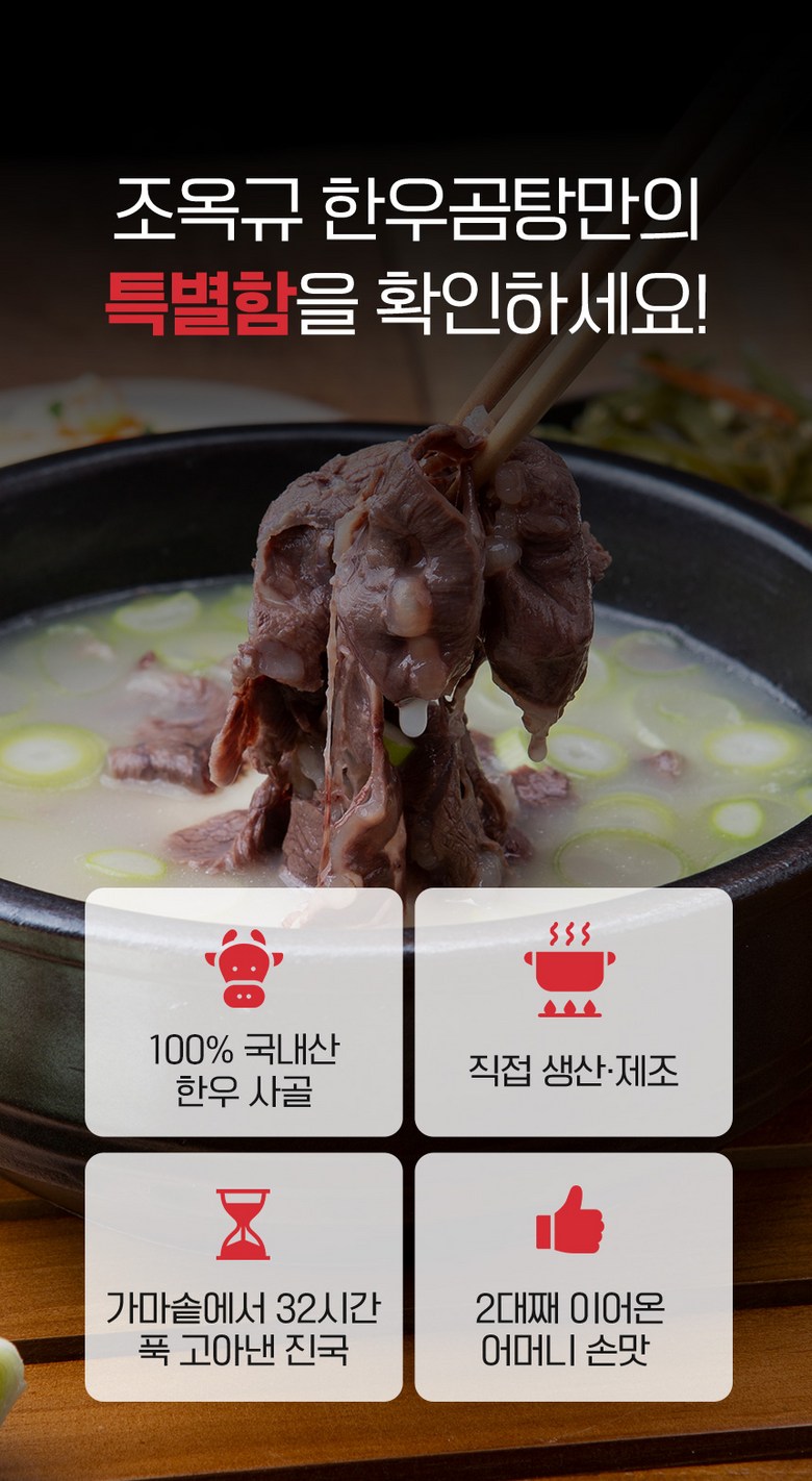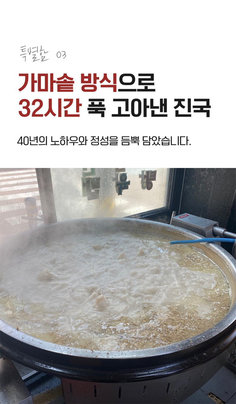 가마솥 직화 방식으로 32시간 푹 고아낸 한우사골곰탕은 옛날 엄마가 해준 정성 가득한 맛 그대로 느낄 수 있습니다!