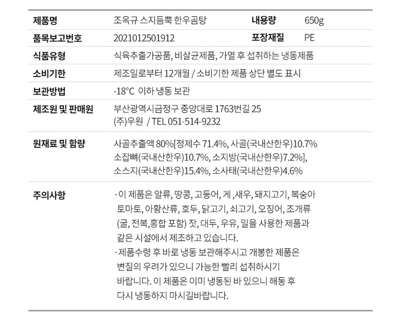 | 제조연월일, 소비기한 또는 품질유지기한 | 상품 상세페이지 참조 | 세부 품목군별 표시사항 | 상품 상세페이지 참조 |