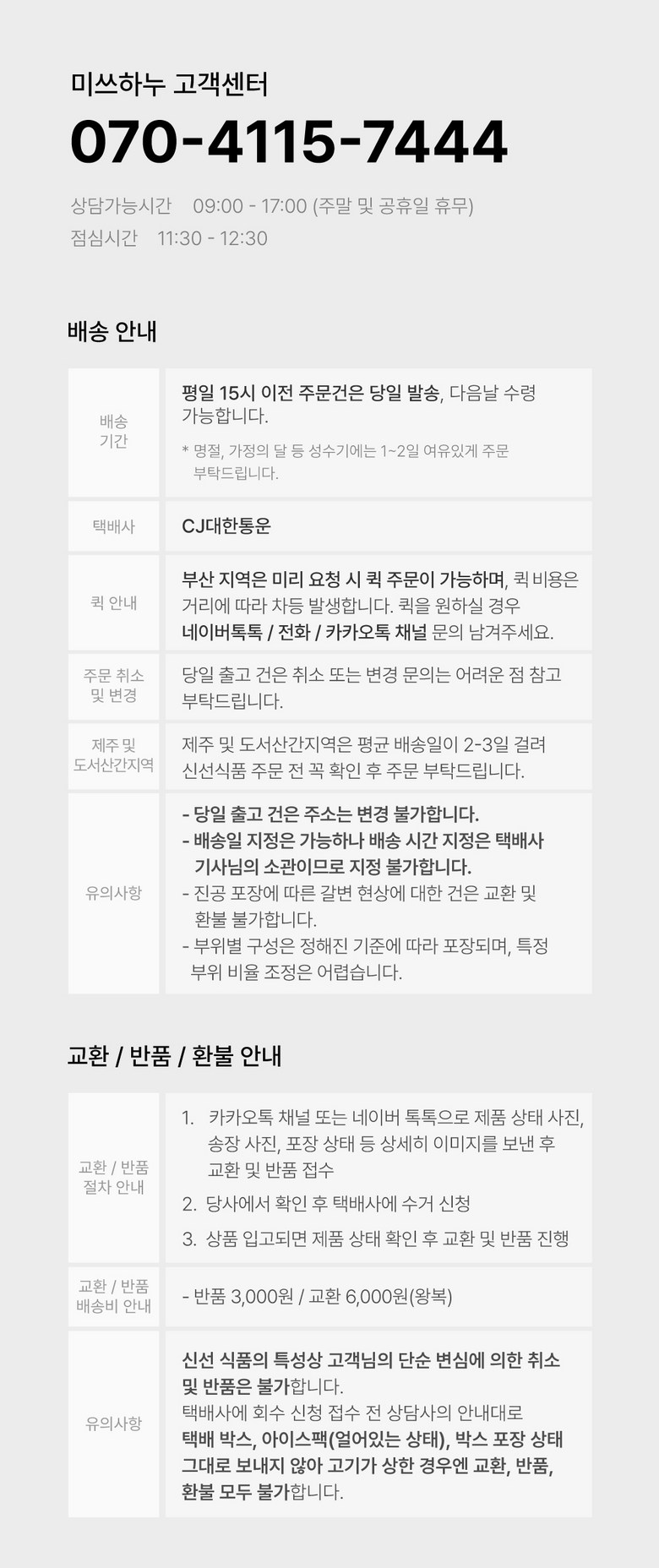 | 배송방법 | 신선/냉장/냉동 | 배송비 | 무료배송 · 도서산간 추가 배송비 - 제주 지역: 5,000원 - 도서산간 지역: 5,000원 |