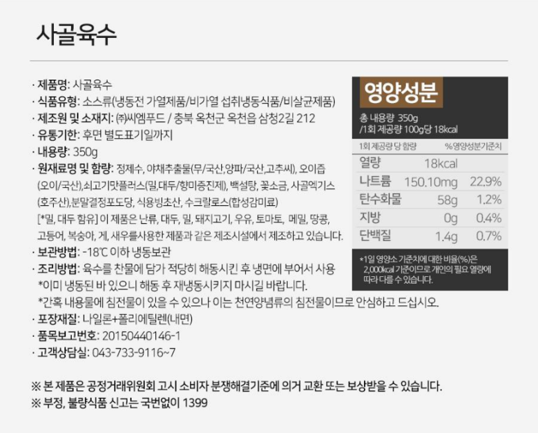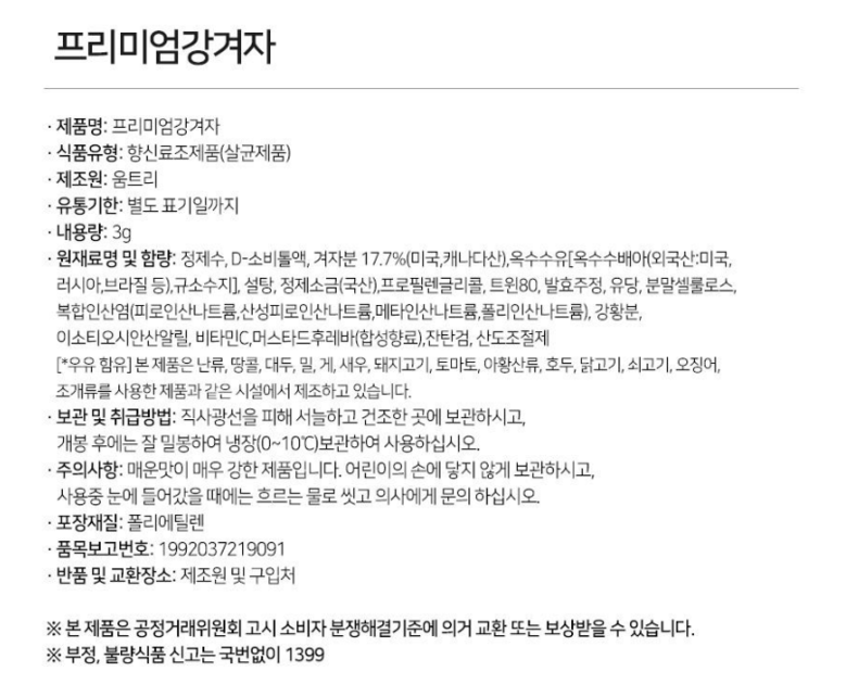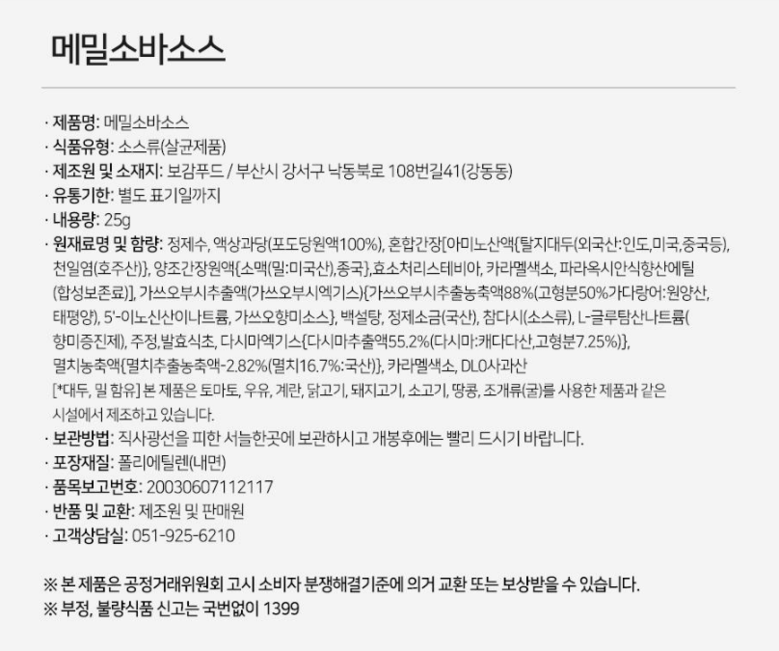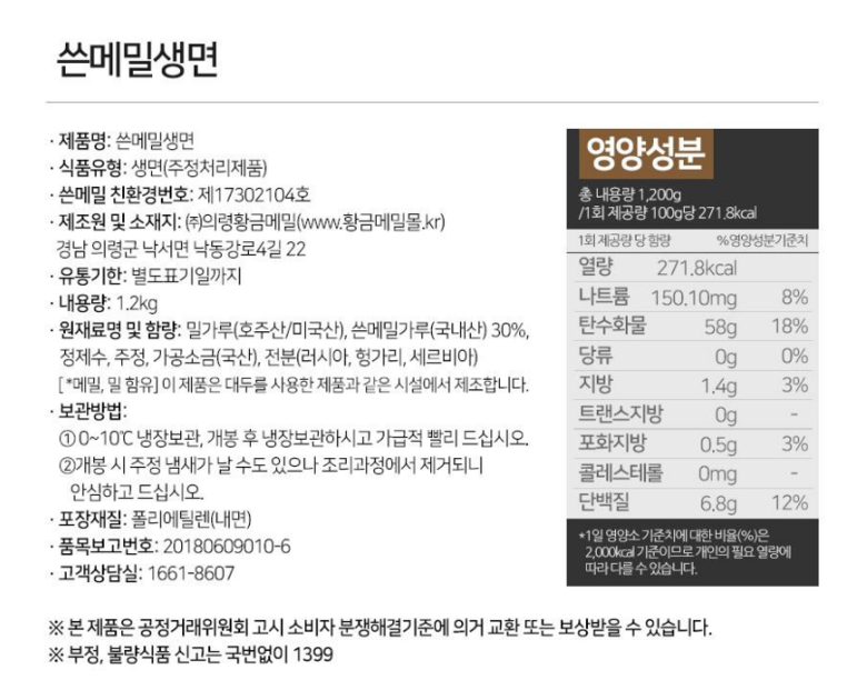 | 제품명 | 상품 상세페이지 참조 | 식품의 유형 | 생면 |