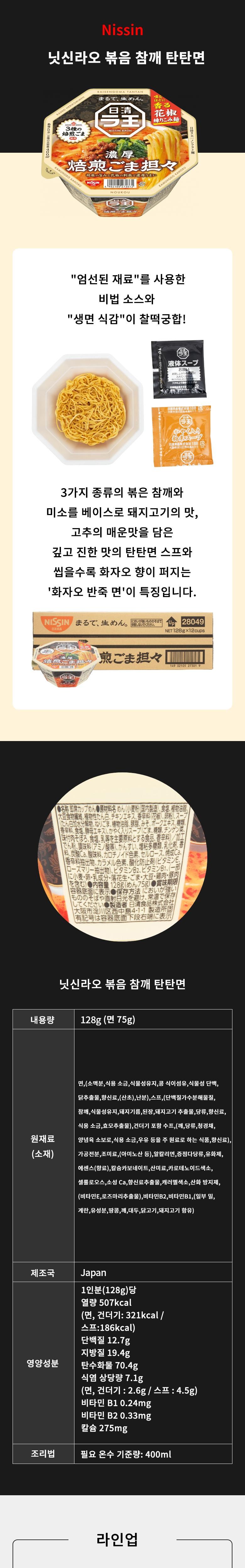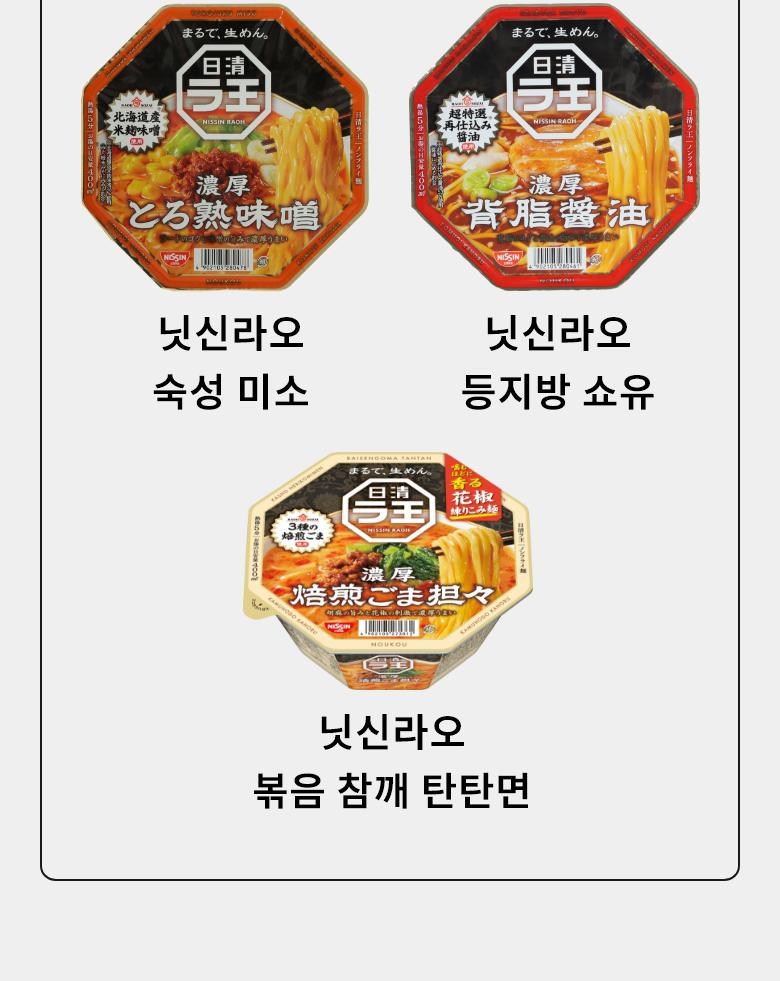 | 생산자 및 소재지 | Nissin Foods,Japan | 제조연월일, 소비기한 또는 품질유지기한 | 상품 상세페이지 참조 |