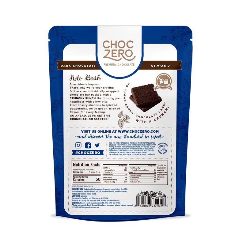 설탕 대신 몽크 프루츠로 단 맛을 더한 맛있는 다크 초콜릿 바입니다. 구운 아몬드와 씨솔트를 뿌려 더욱 맛있습니다. 바삭하고 짭짤한 맛이 55%의 다크 초콜릿과 더욱 잘 어우러집니다. 탄수화물 함량이 낮으며 케토제닉을 위한 간식으로 안성맞춤입니다.