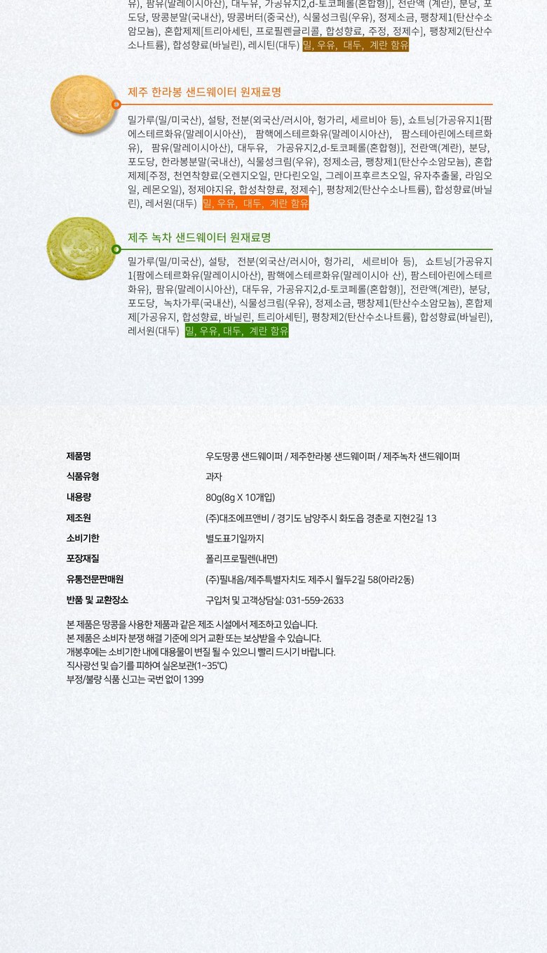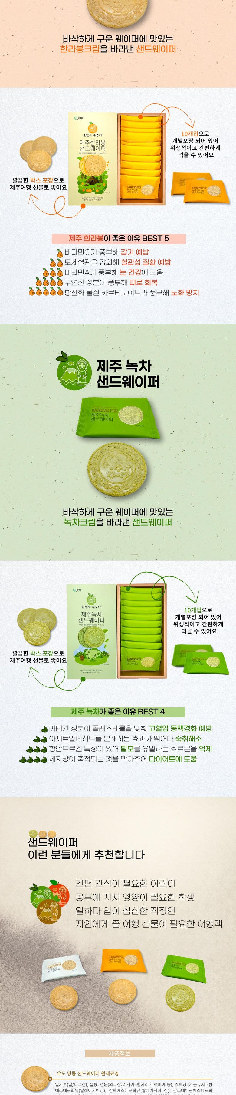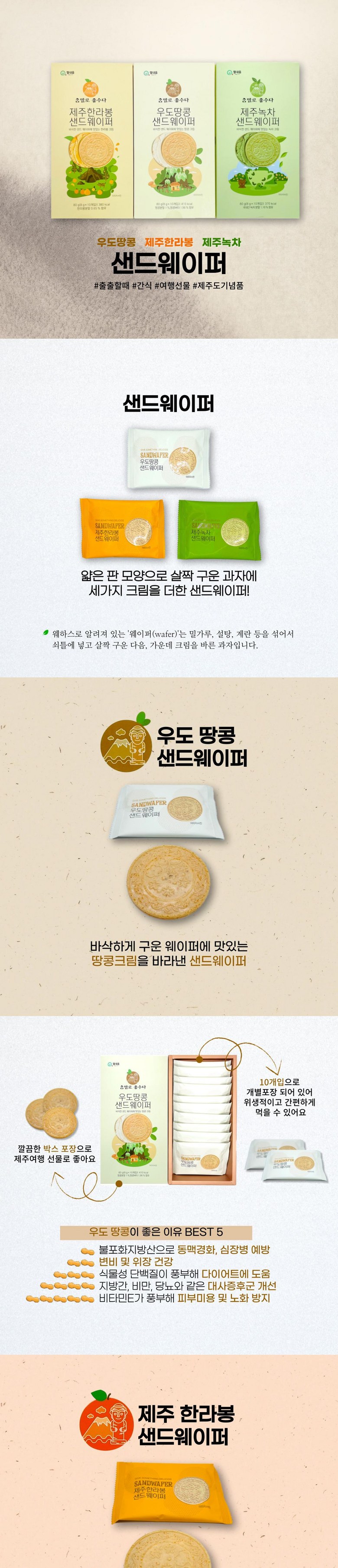 | 제품명 | 제주 우도땅콩 한라봉 녹차 샌드웨이퍼 | 식품의 유형 | 과자 |