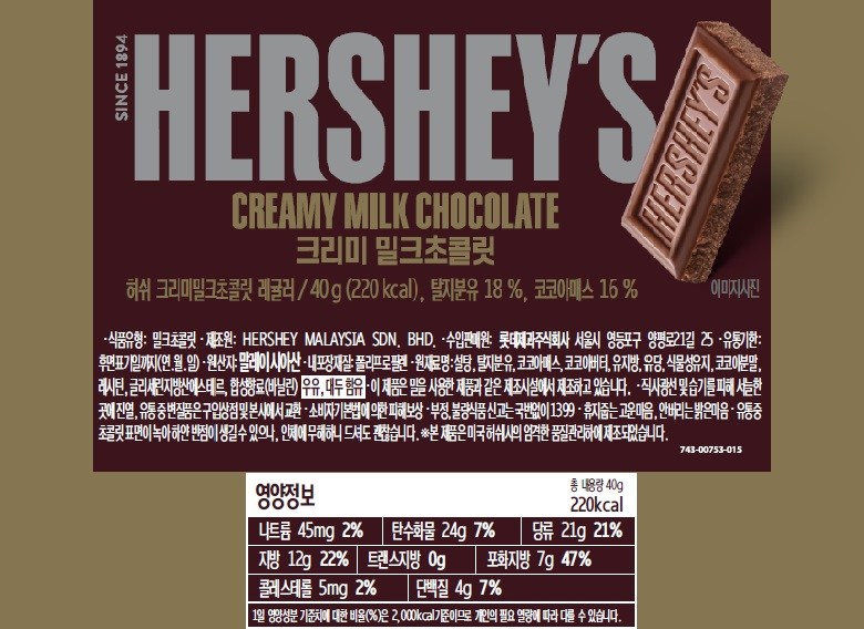 | 제품명 | 허쉬 크리미 밀크 초콜릿 | 식품의 유형 | 컨텐츠 참조 |