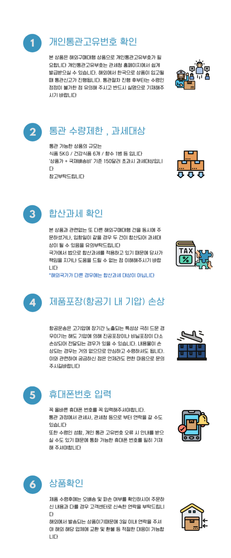- 법규 개정에 따라 개인통관고유부호 검증 절차가 강화되었습니다. 결제 단계에서 받는 사람의 정보가 관세청 등록 정보 (성명, 휴대폰, 개인통관고유부호, 주소) 와 일치하는지 확인해주세요.