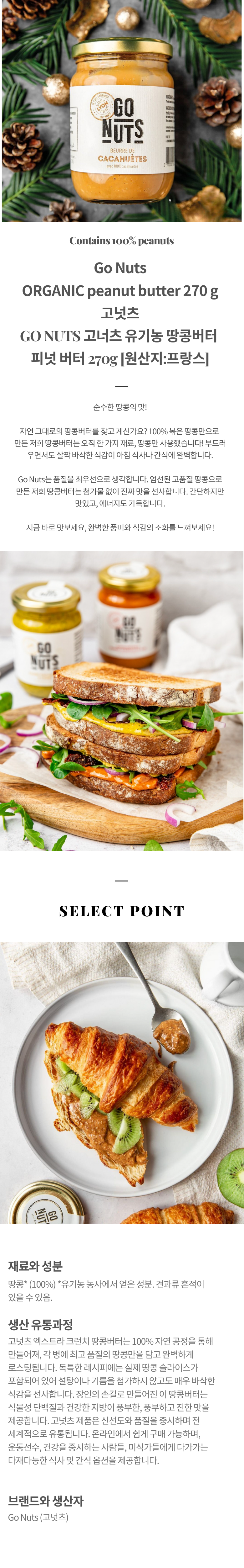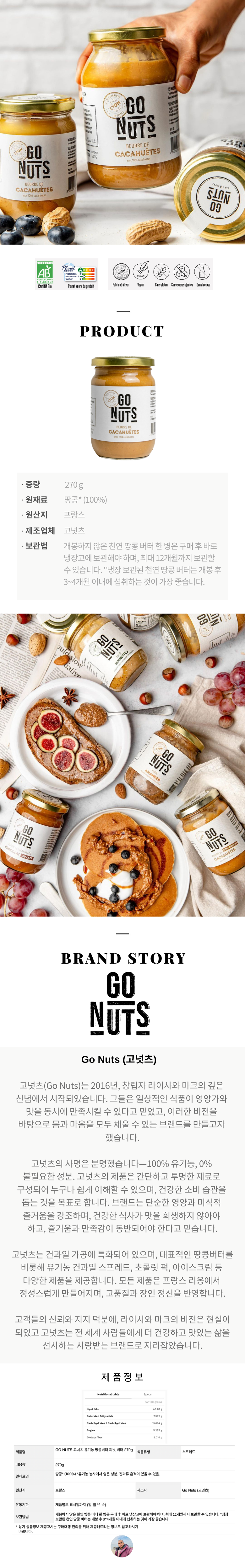 | 제품명 | Go nuts 고넛츠 유기농 땅콩버터 270g | 식품의 유형 | 땅콩버터 |